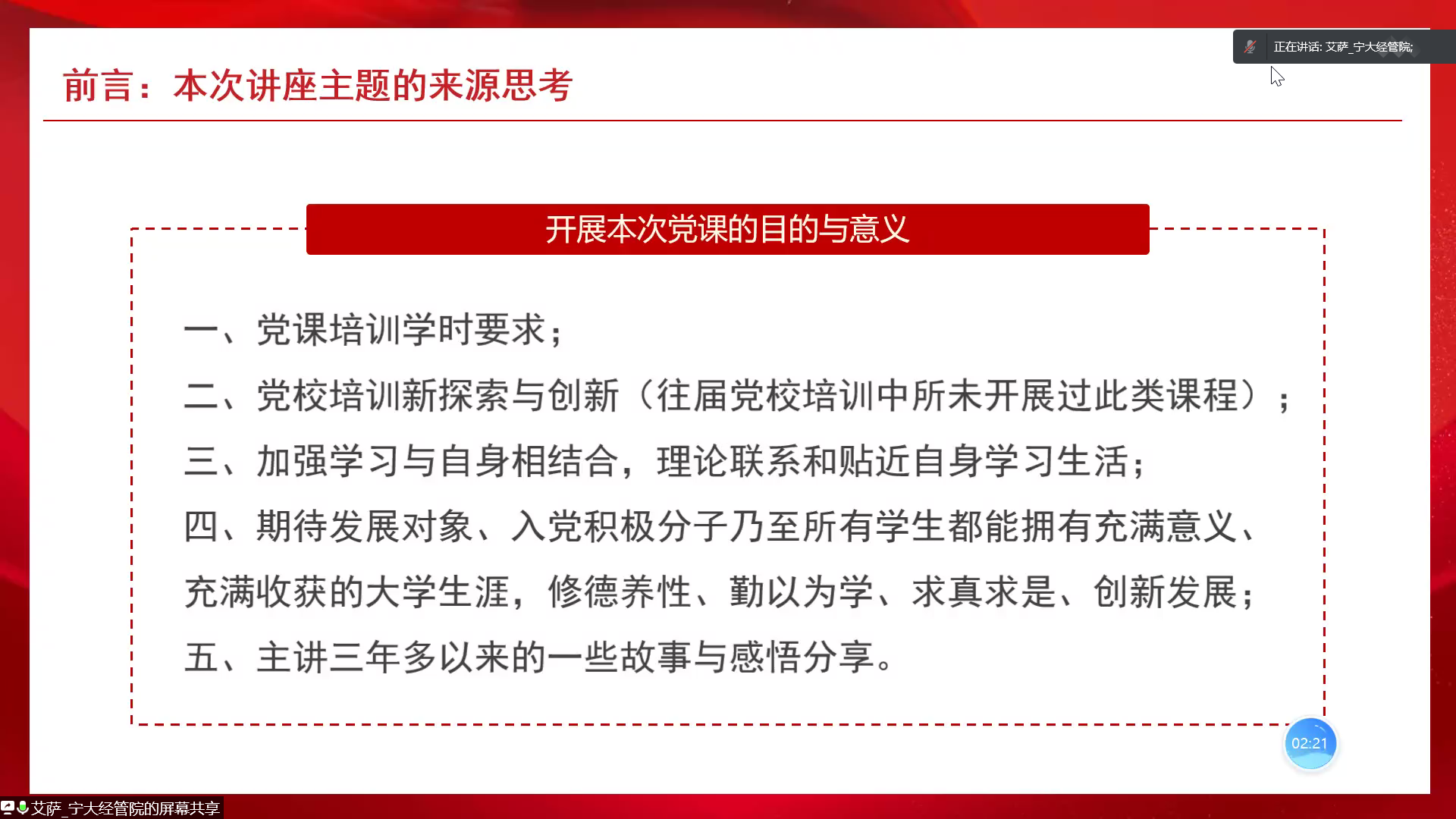 艾萨从五个方面介绍了本次党课的目的及意义。一是党课培训学时要求;二是党校培训新探索与创新;三是加强学习与自身相结合,理论联系和贴近自身学习生活;四是期待发展对象和入党积极分子乃至所有学生都能拥有充满意义与收获的大学生涯,修德养性、勤以为学、求真求是、创新发展;五是分享自己三年多以来的一些故事与感悟。