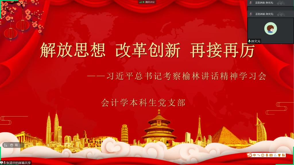 会计学本科生党支部于10月27日晚在线上组织全体支部党员开展了“解放思想、改革创新、再接再厉”主题党日活动。会计学本科生党支部书记孙文元、会计学本科生党支部全体党员参加了本次学习,会议由张清华主持。