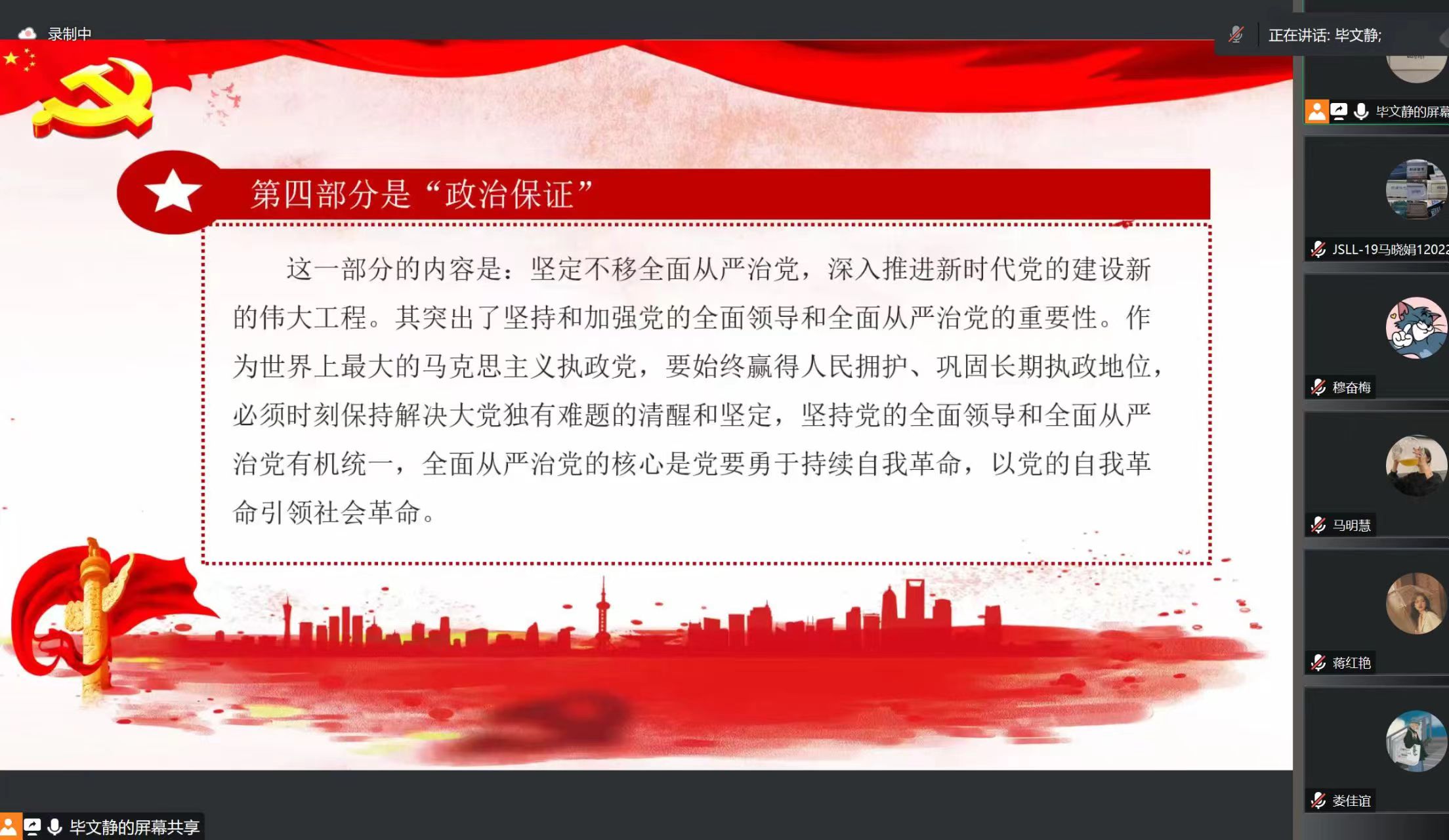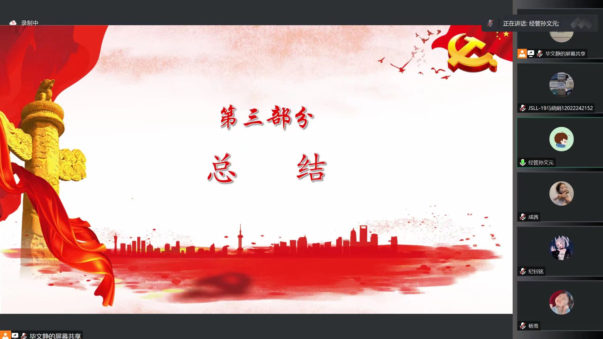 纯洁党、严格党、勇敢党、温暖党四个小组党员代表分别就本次学习进行分享,各小组代表从党员作风、民生福祉、中国式现代化、人与自然、教育、伟大复兴及高质量发展等方面分享了自己本次学习的收获和感悟。孙文元从青年工作的重要性这一角度分享了自己本期的学习心得,并对支部本次的学习进行了总结。