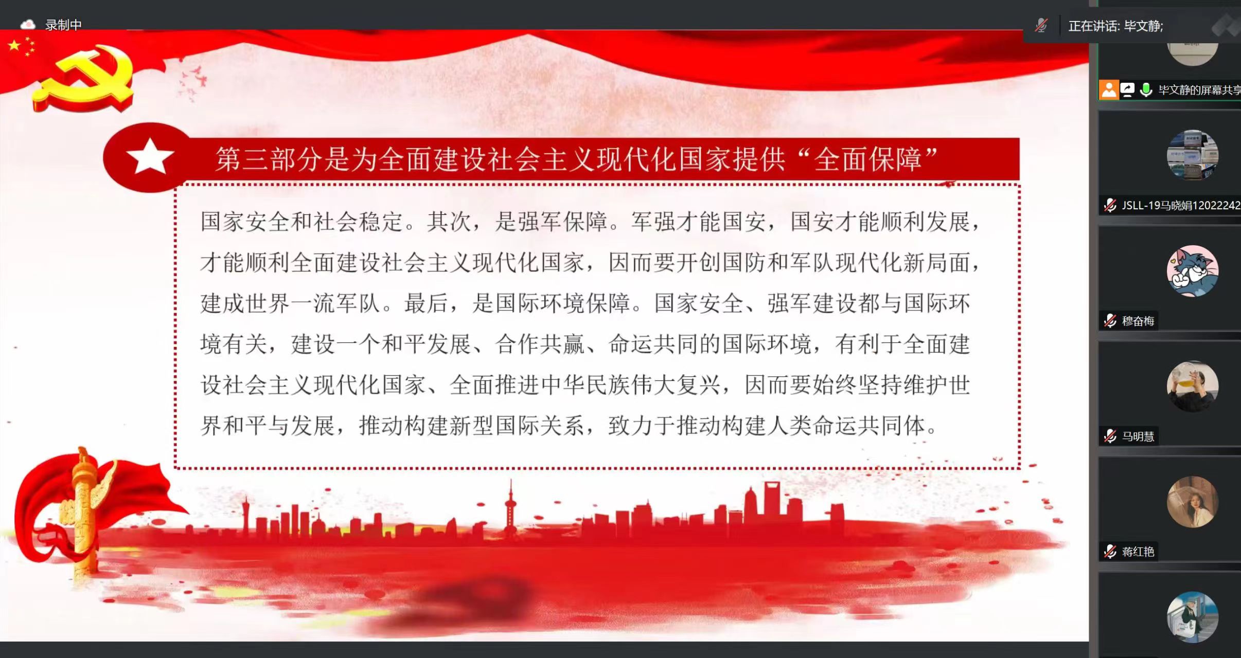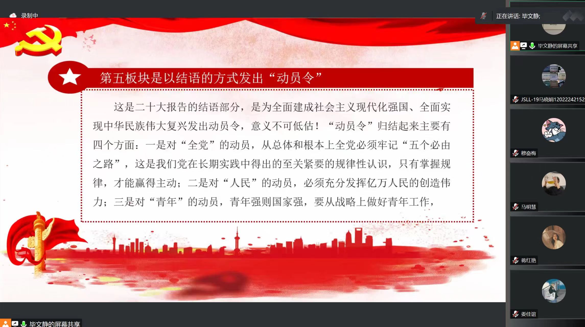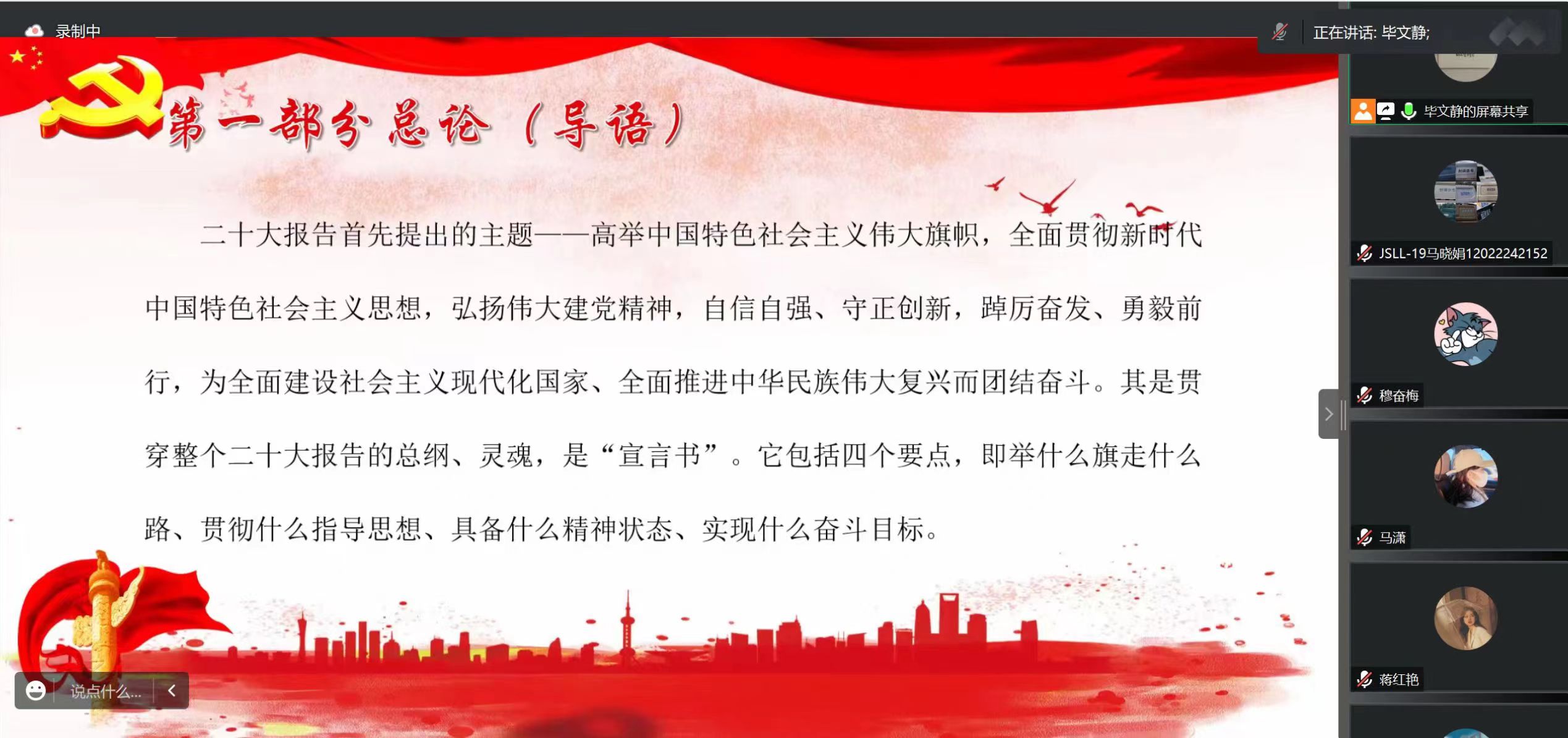 会议伊始,毕文静就二十大报告的总体框架结构进行讲解学习,分别讲解了二十大报告总论,及第二、三、四部分的内容及其独特地位和作用,并对第五部分的“动员令”作出详细地讲读。