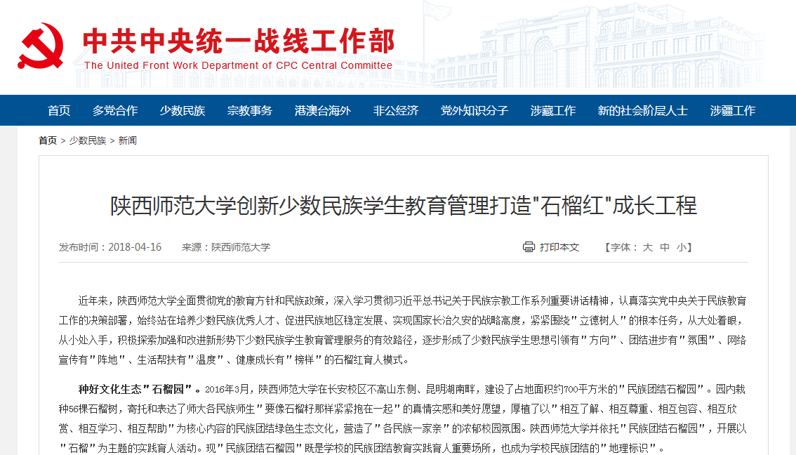 创新少数民族学生教育管理打造‘石榴红’成长工程”的工作举措。此信息稿由党委学工部、党委统战部联合供稿、报送。