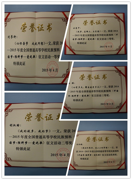 学生在2015年“中国梦•预科梦”征文比赛中的获奖证书。