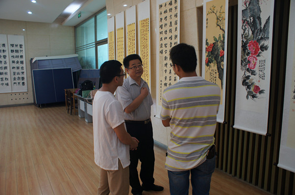 开幕式后,到场师生认真观赏了展出作品。郑生忠老师对展出作品进行了点评,并与同学们进行了现场书法创作,交流心得体会。