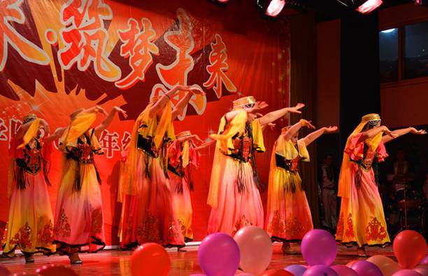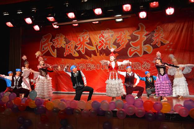 晚会正式开始前,首先进行了颁奖仪式,重点表彰了对在2014—2015学年度中表现突出的优秀学生、优秀学生干部,以及在民族团结活动月中表现优异的学生和集体。院长冯建新和党总支副书记窦文阳宣读获奖名单,学工部副部长芮国星、党总支书记郑生忠上台为获奖学生颁奖并合影留念。接下来,在一曲哈萨克传统舞蹈《恰熟》中,晚会正式开始。歌舞《中国我为你歌唱》、合唱《爱我中华》表现了当代青年学子朝气蓬勃、积极进取、昂扬向上的新形象;预科同学带来的舞蹈《吉祥谣》、《萨吾尔登》、《刀郎舞》、《梦幻花园》、《赛马舞》、《异域风情》展示了赌场老虎机