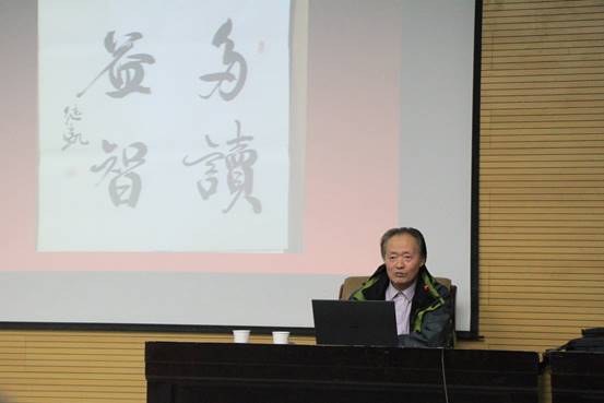 的时间,多读书,丰富知识。其次,李教授和同学分享了读书的乐趣,以及自己在读书方面所获得成就,迎来了现场热烈的掌声,李教授分别对鲁迅异地求学,弃医从文。郭沫若才子书缘,创造情结。矛盾勤能补拙,师者品格兼及金庸的读史和莫言的读硕做了详细的介绍。他们都是一代文豪,他们的作品值得同学们去细细的品味去学习。最后,李教授讲到了书法,他说,书法是和文学分不开的。中国古今文人作家与书法文化的关联非常密切,作家文人和书法家都是主要以书写为生的。在书法文化创造方面都有着重要贡献。他举出了卫俊秀的“拥书自雄”,沈尹默的“读书与书法”史星文的“书房和书法”。