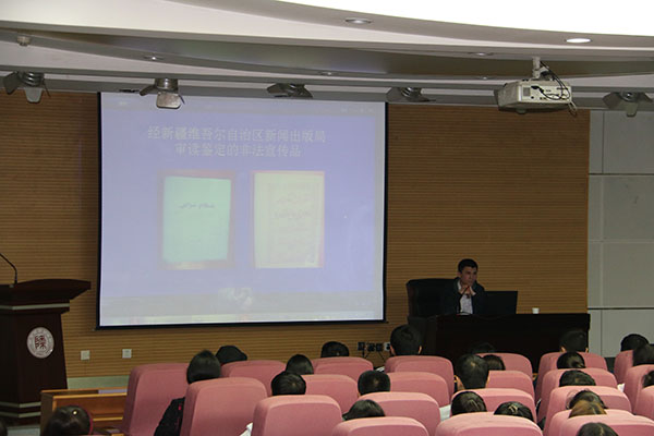 首先,马木提江教导员以近几年内地高校少数民族学生中所发生的典型案例为切入点,说明了极端宗教问题的起源、本质、存在根源及发展规律。然后,他结合高校少数民族大学生的思想实际,详细讲述了如何正确区别合法宗教、非法宗教活动,使学生进一步认清极端宗教思想的危害和本质,引导学生提升抵御宗教极端思想渗透的能力,以实际行动维护民族团结、维护校园稳定。最后,他向在场同学提出了三点希望,一是希望同学们用理性分析和科学思考对待处理宗教问题,不断提高对民族历史和宗教历史等的认识;二是希望同学们要注重社会意识和社会责任感的养成,提高法律意识,增强明辨是非能力,准确选择符合自身实际和社会需求的发展方向;三是希望同学们珍惜大学时光,掌握更多知识和技能,脚踏实地,切实制定自己的奋斗目标,努力成为一名对国家和社会有用的人。