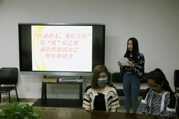 言行、假期兼职、家庭教育为出发点,列举了很多有关诚信的感人事例。同学们表示无论在学习、生活、还是工作中都很有信心并坚持做到说老实话,办老实事,做老实人,把诚信教育继续发扬光大。辅导员热依木老师总结道:“作为高校少数民族辅导员,也作为高校一名普通教师,我的任务是教书育人,服务育人,在我自己的工作当中也处处离不开诚信,否则就会失去同学们的信任。希望大家从自身做起,诚实守信,努力实现自己的梦想,实现人生的价值。”