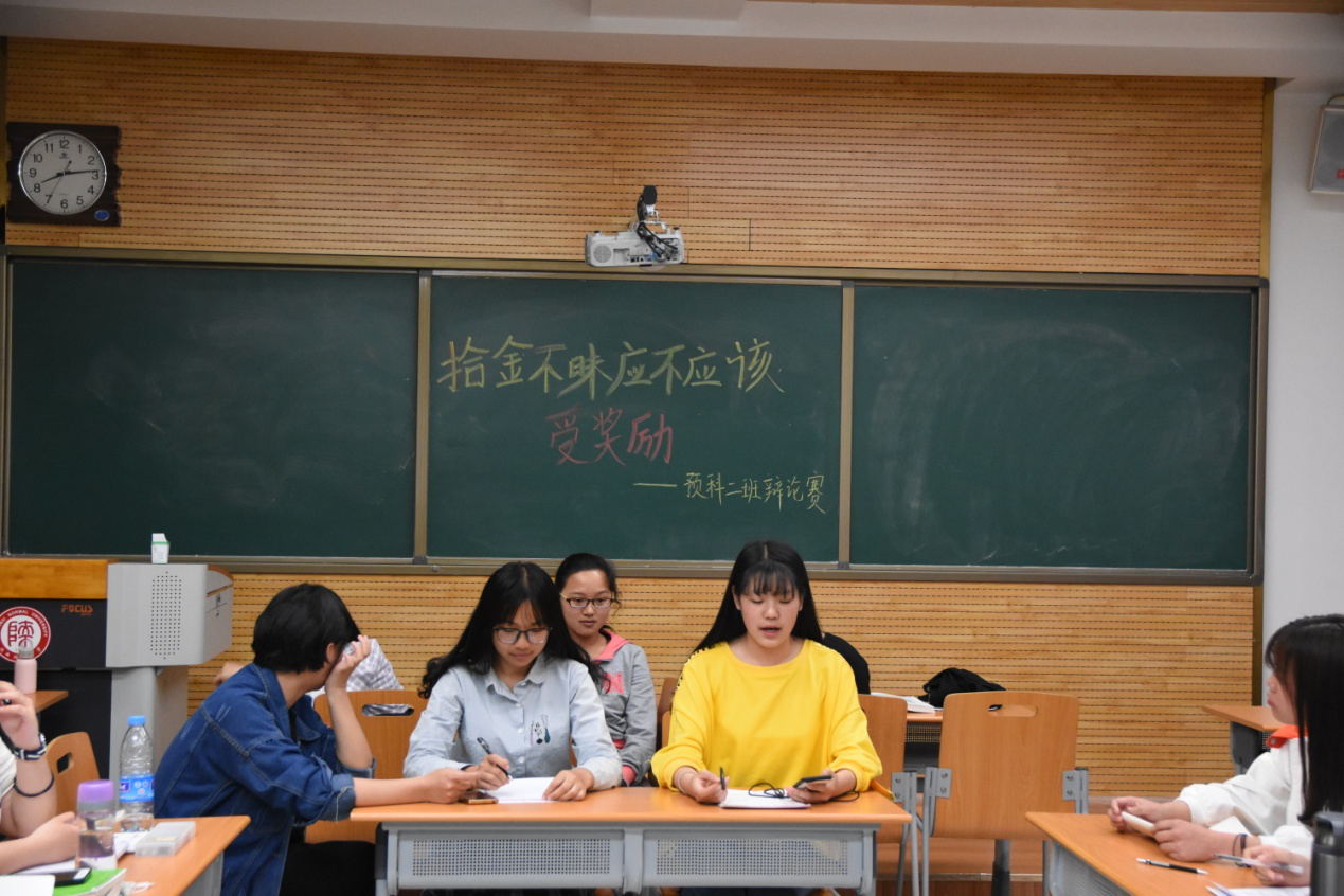 “以诚待人,秉信立行”辩论赛中,预科2班的同学举行了以“拾金不昧应不应该受到奖励”为辩题的辩论赛。辩论赛分为陈词阶段、盘问阶段、自由辩论阶段、观众提问、总结陈词五部分。在立论阶段,双方辩手就初露锋芒,蓄势待发,双方二辩三辩的交锋更是激烈。在自由辩论环节,双方激烈交锋,达到了辩论赛的高潮。观众现场提问,不仅让其他同学都能参与进辩论,也让辩手们多了展现自己的机会。最后双方选手现场总结陈词。通过辩论赛,不仅使同学们树立了正确的诚信观,而且还为少数民族同学们提供了一个提高汉语普通话口语表达的平台。同学们说,这场辩论不仅带给他们一场视觉听觉上的盛宴,也让他们知道作为大学生肩负着引领校园风气发展的使命。