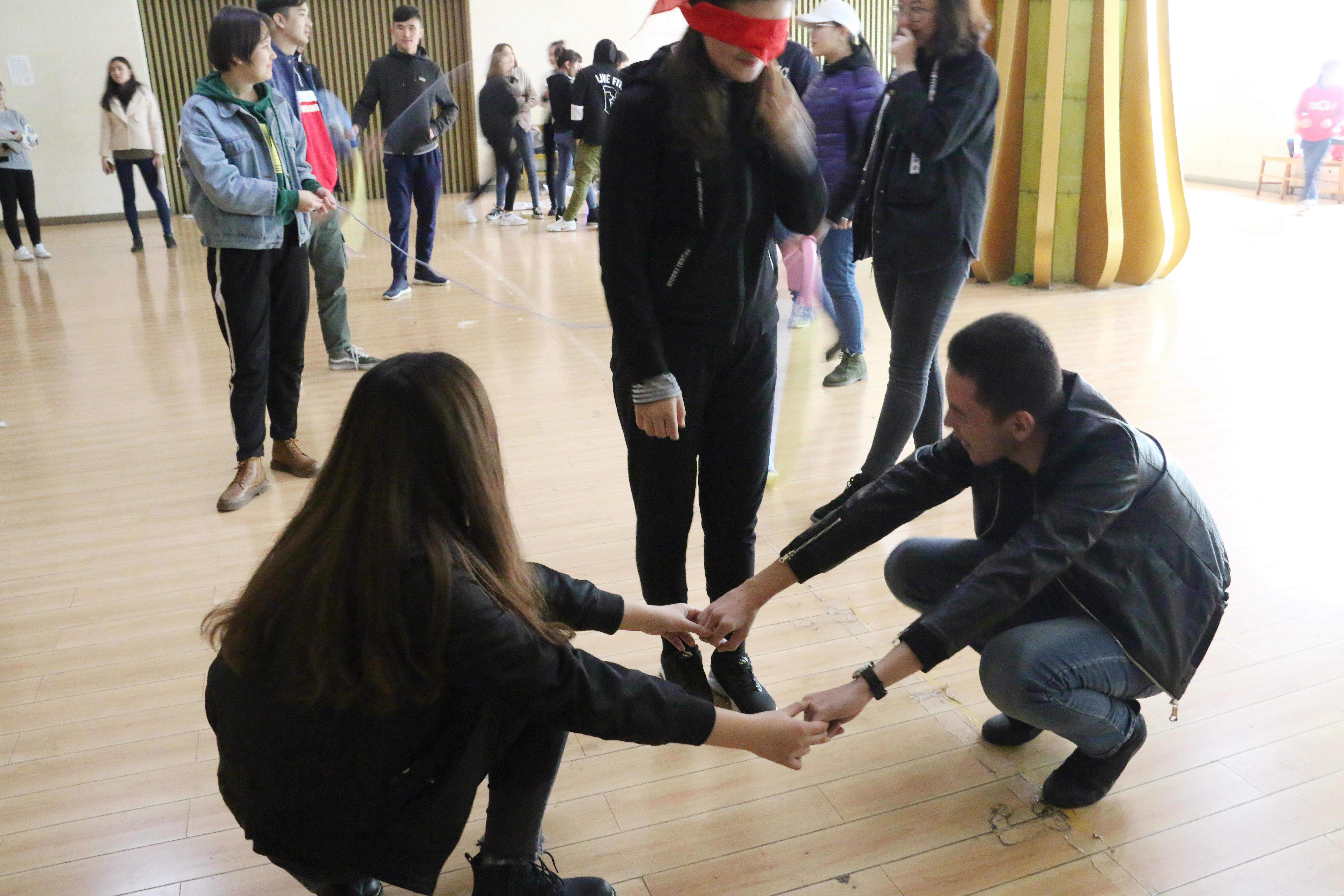 活动前,预科三班兼职辅导员高凤荣老师就举行团体心理辅导活动的整体要求和注意事项做了简单的讲解。主持人介绍本次活动主题及活动内容之后,带领全体同学开展“破冰之旅—接龙、放松; 无家可归”、“助人受助——盲行”、“同舟共济”、“心有千千结”、“吹气球,减压力”等互动游戏。每一个游戏都在愉悦的氛围下圆满结束,活动过程充满欢声笑语,同学们都积极参与,建言献策,发表自己的看法。活动最后,同学们欢快地跳起了民族舞蹈,表达收获的好心情。