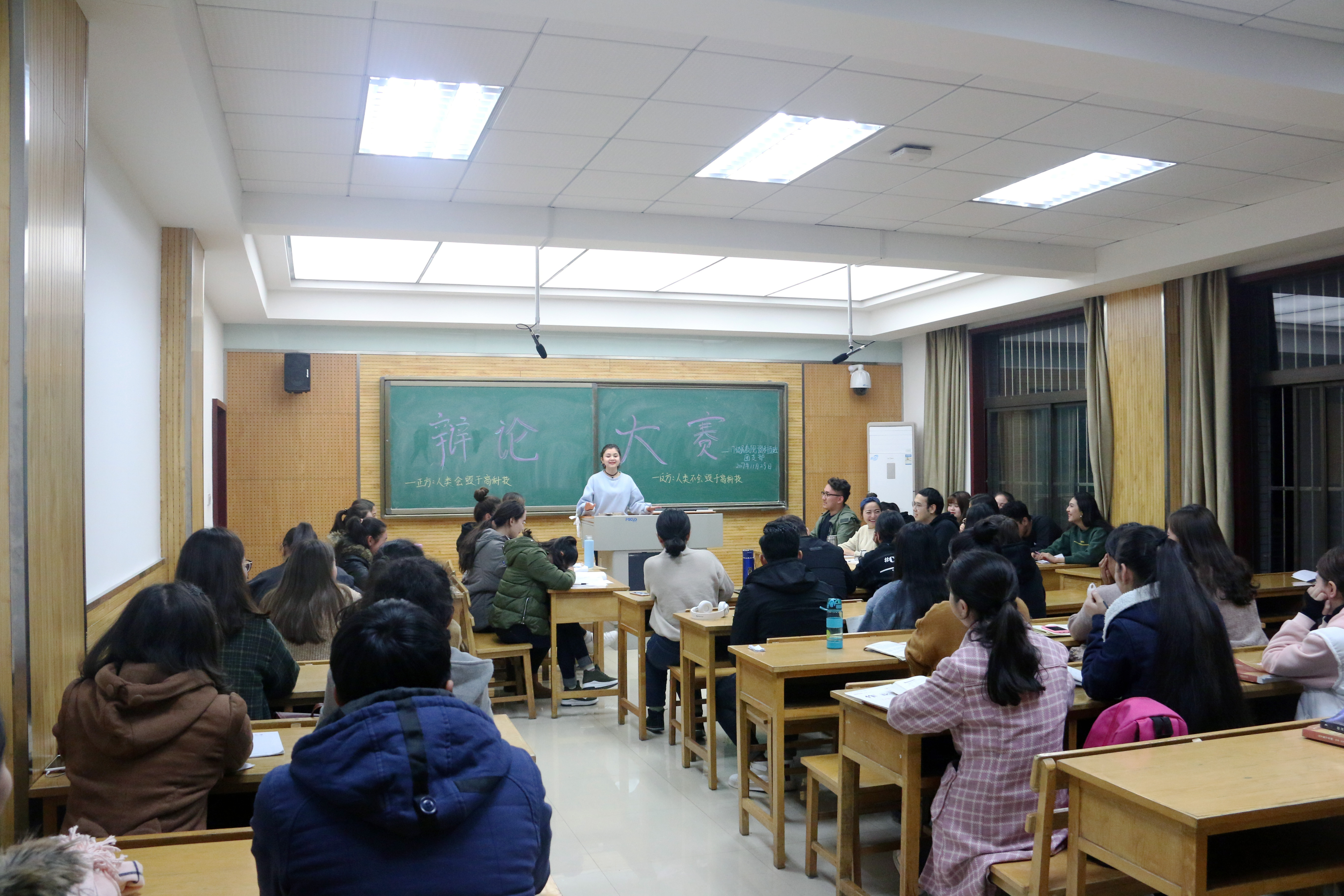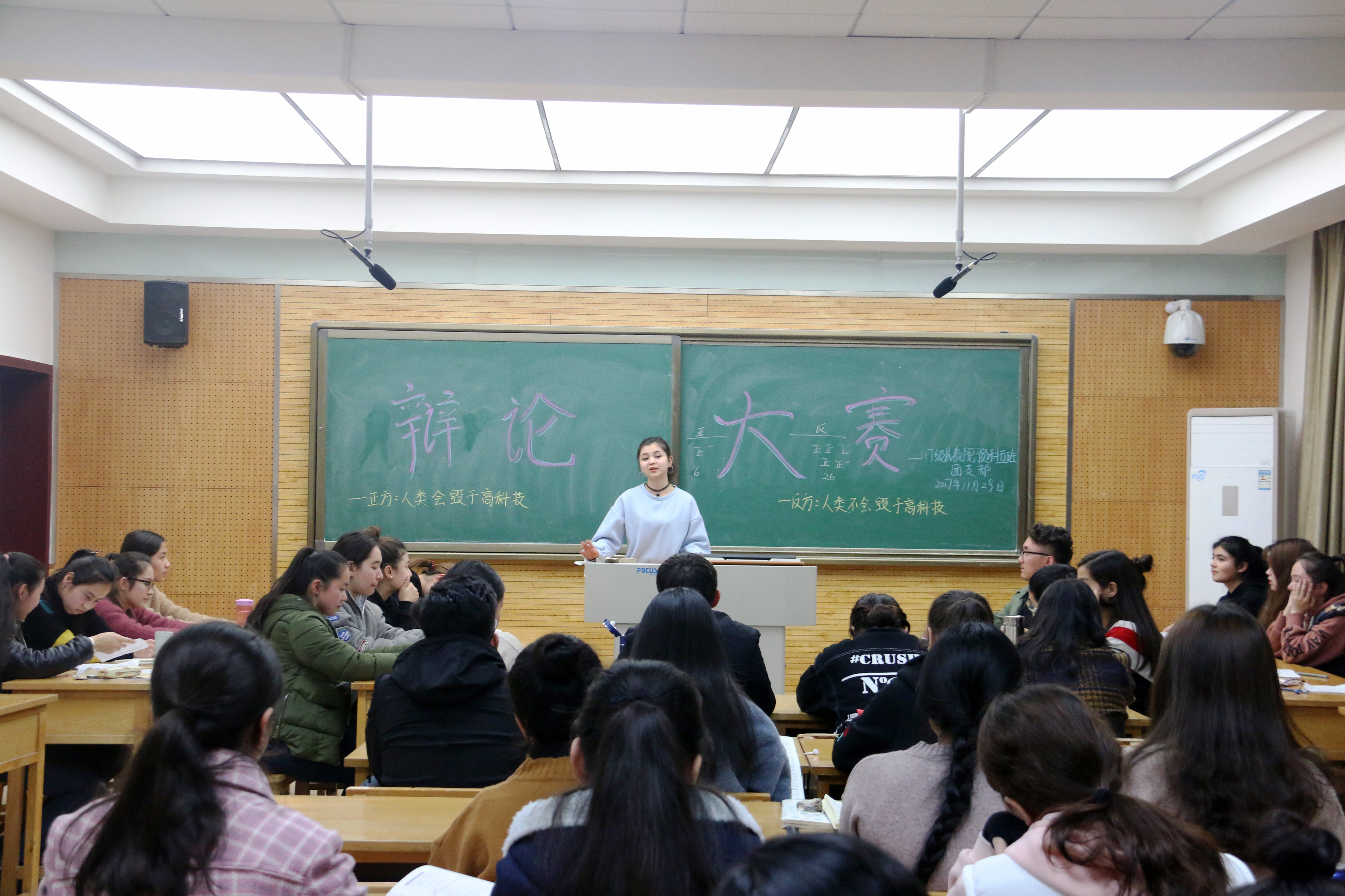 本次辩论赛主题紧扣科技发展与人类生活这一社会关注的热点,以“人类是否会毁于高科技”为辩论主题展开辩论。活动秩序井然地进行,由主持人凯蒂亚向大众评委与参赛选手说明辩论赛规则,并提出了相关赛事要求。主持人宣布辩论赛正式开始。首先,是双方的立论陈词。正方一辩陈述了正方“人类会毁于高科技”的观点,辩手条理清晰,逻辑明确,分三点提出正方观点。而持“人类不会毁于高科技”的反方也不甘示弱,列举蒸汽机的发明与工业革命,进而谈论其中与女性独立的关系引观众深思。紧接着是补充立论环节,双方辩手在两分钟的时间内对己方观点做了更为详细严谨的补充。在接下来的二辩对攻环节中,双方辩手引经据典,互不相让,现场思绪碰撞的火花四溅,蔓延进观众席中,精彩的对决将气氛推向了高潮!比赛继续进行,在自由辩论环节,双方更是针锋相对,步步紧逼,比赛进入白热化阶段。现场时而掌声不断,时而有因辩手们有趣的陈词而响起的阵阵笑声。进入观众向辩手提问环节,忍了很久的观众席冒出各种各样精彩的问题,辩手们也镇定自若地给出令人满意的答案。最后,比赛进入总结陈词环节,双方四辩流利的具有高度概括性的陈述为本场辩论画上完美句号,圆满结束此次辩论赛。最后,经过大众评委投票,反方取得最终胜利。