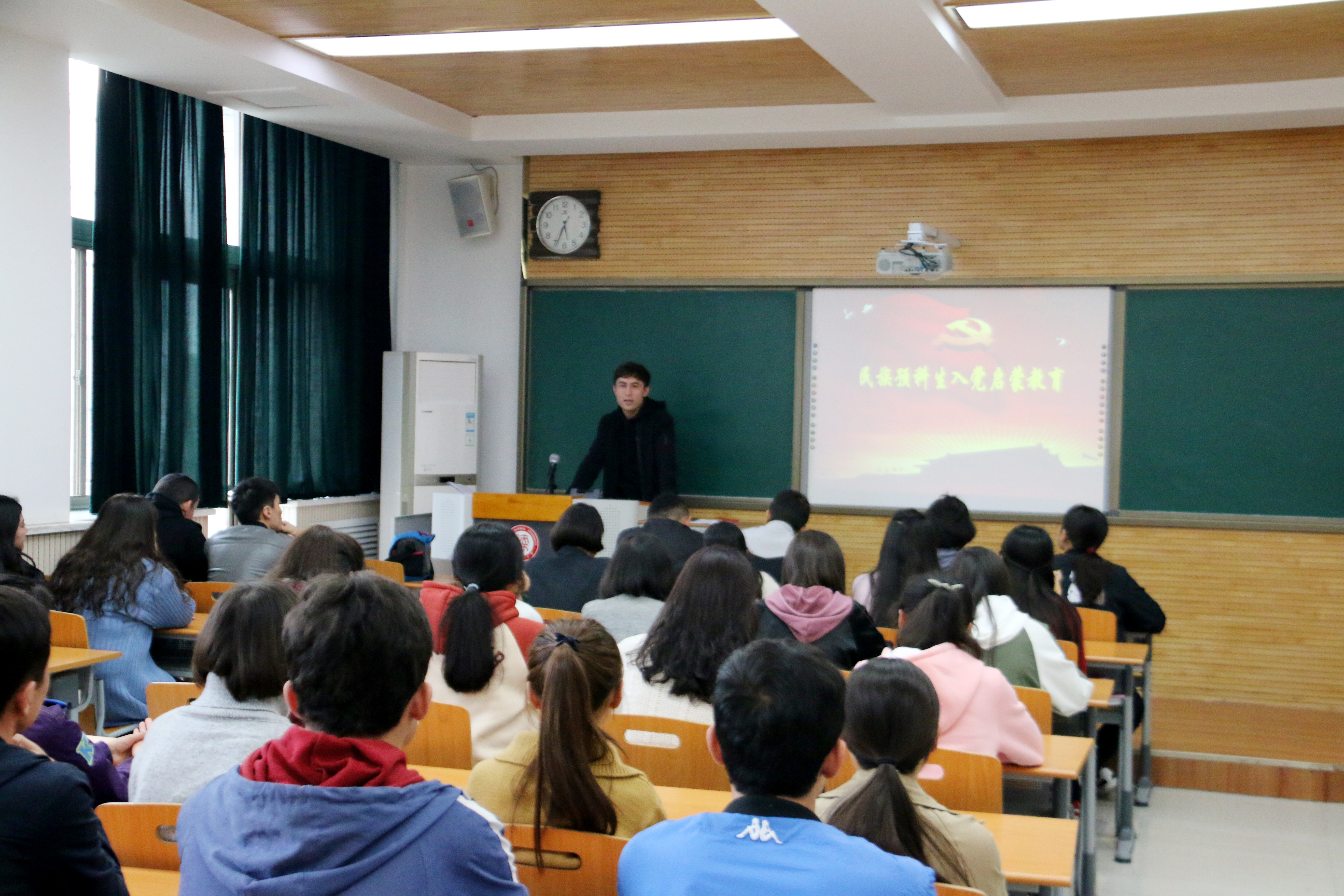 在班会上,各班团支书对近期组织班级所观看的红色影视做了简短的观后感汇报,汇报中,同学们都深深地感受到了我党历史上的艰辛并对如今我党新时代下的成绩感到骄傲和自豪。然后各班专兼职辅导员老师围绕党的十九大报告精神与新党章内容做了简单的介绍和教育。随后,针对为什么要加入中国共产党?怎么加入中国共产党?以及加入中国共产党的要求三个方面向学生做出了详细的阐述,具体向大家介绍了中国共产党的历史、性质、宗旨、最高理想等。使学生更加深入地了解了中国共产党。让同学们受到了思想上的洗礼,明白党组织是一个先进的集体,坚定了同学们的入党信念。老师们还对入党的流程给学生作出了简要阐述,对学生所提出的入党能不能挂科,如何撰写入党申请书等相关问题做出了简要回答。使学生对于入党的流程以及规范有了更加清晰的认识。最后,各班辅导员老师在学生中出现的主要问题上做了正确的引领和教育,向大家提出了一定要端正自己入党动机的要求,并结合历届入党积极分子为例,鼓励大家提高自己的思想意识,积极参与到入党的筹备工作当中去。