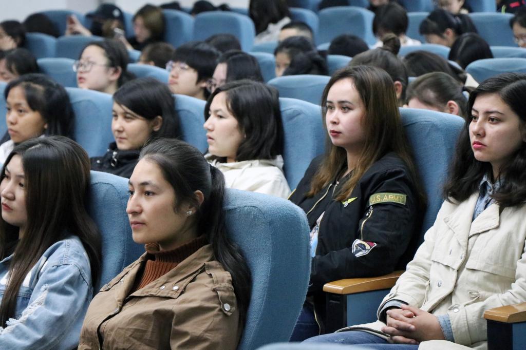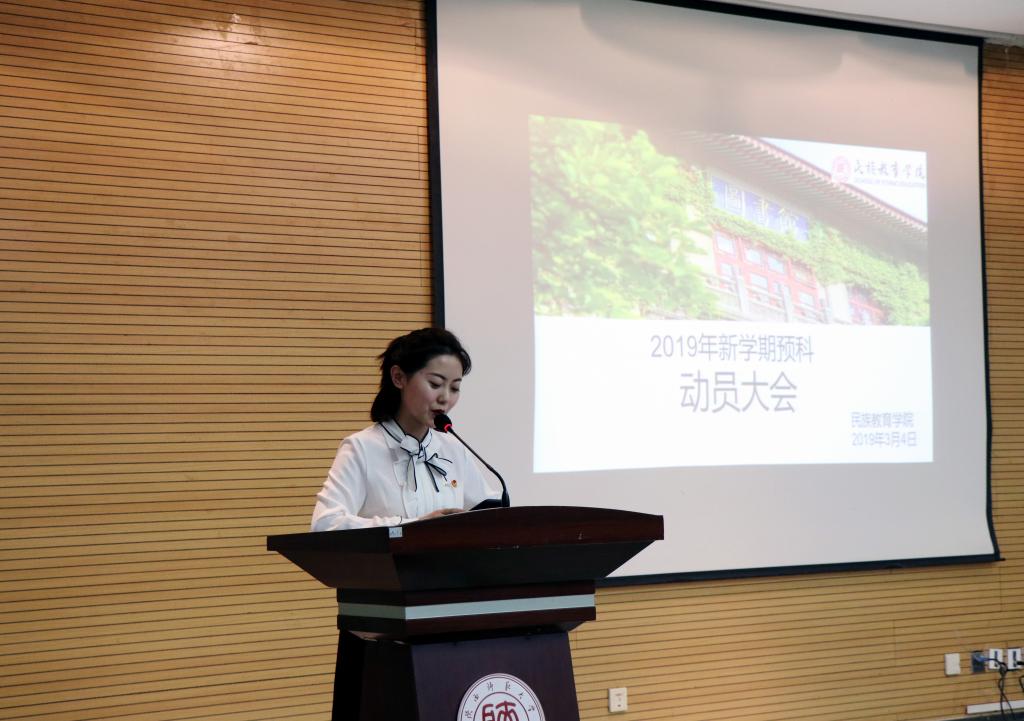 往届学生会主席白日也用幽默风趣的话语向同学们讲述了他的运动会经历,他觉得像运动会这样有意义的集体活动会给预科生活留下美好的回忆,希望同学们把握机会,积极参与,不要留下遗憾,并告诉参赛运动员要有方法、有技巧地训练,才能事半功倍。在他生动有趣的运动会故事中,同学们深受感染,热情高涨,立志要在运动会中一展风采。随后,2018级预科三班沙米哈同学代表预科生上台分享了自己半年的预科感想和寒假见闻,她用诚挚的语言讲述了半年期间在民教院的所感所想,她说预科阶段的学习有助于同学们做到自信、自律、自强,从而在德、智、体、美等方面得到综合发展与提高,为将来完成本科阶段的学习打下扎实的基础。