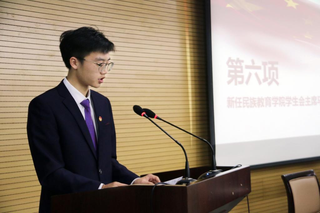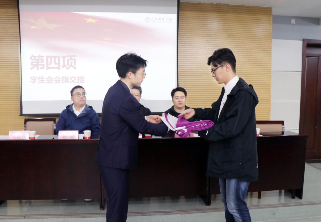 2018级学生会副主席奥宁与新一届学生会主席马得胜进行了学生会会旗交接仪式。奥宁同学代表2018级学生会做工作总结,在总结中他介绍了过去一年学生会的工作情况,分享了工作感想,并提出了相关建议,期望新一届学生会成员能不断开拓进取,切实努力,提高综合素质能力。新任学生会主席马得胜同学在发言中阐述了自己对学生会、学生干部工作的认识和思考,并提出了新一届学生会几点工作思考和设想,希望全体学生会成员做好基础工作的同时紧跟时代步伐,不断创新,充分发挥学生会组织优势,在全心全意为同学服务的行动和实践中成长,促进学生会工作更上新台阶。