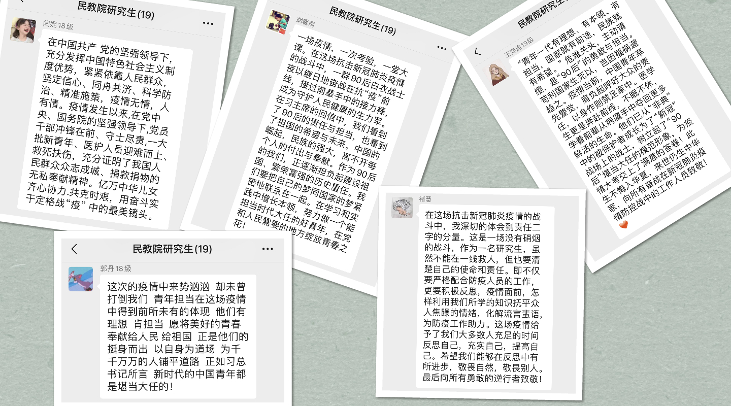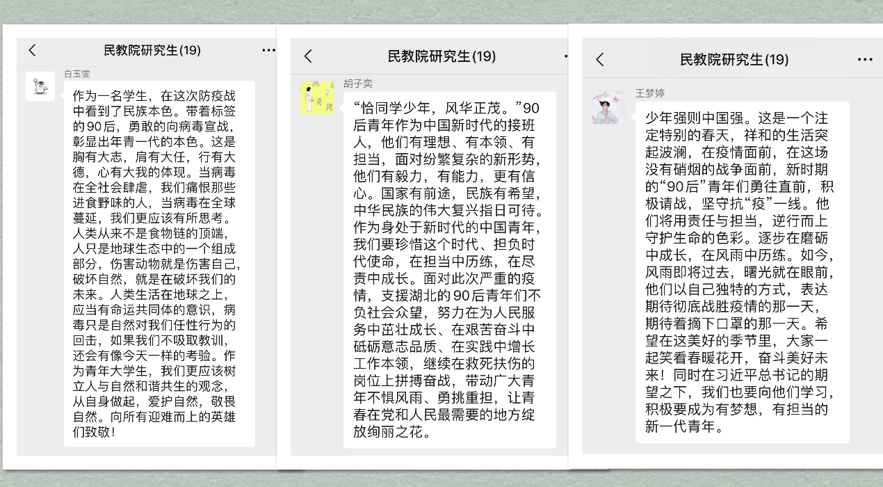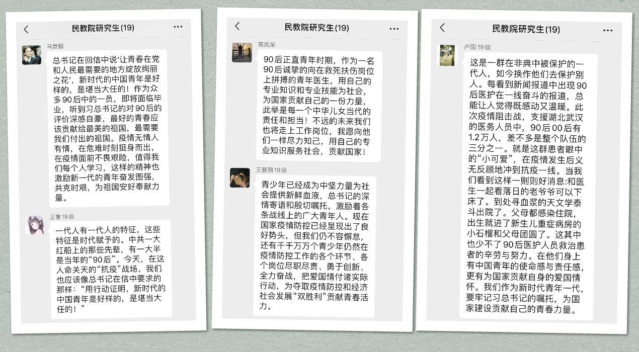 研究生冯祎洁在讨论中说道:“曾经被保护的‘90后’们,在疫情面前挺身而出,冲锋在前,贡献自己的青春力量。一个个破茧陈蝶的报国故事,让我们看到了当代青年在责任担当中青春的‘蝶变’,同作为‘90后’的我们亦应将危机作契机,在挑战中担起社会责任,实现自己的人生价值。”