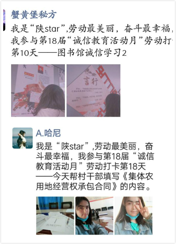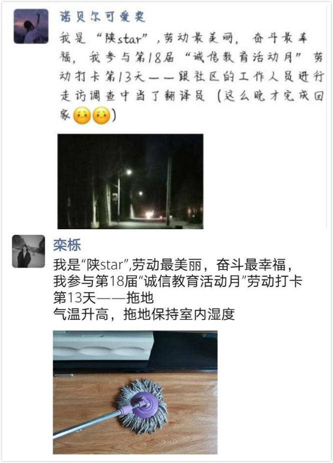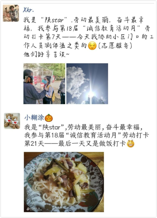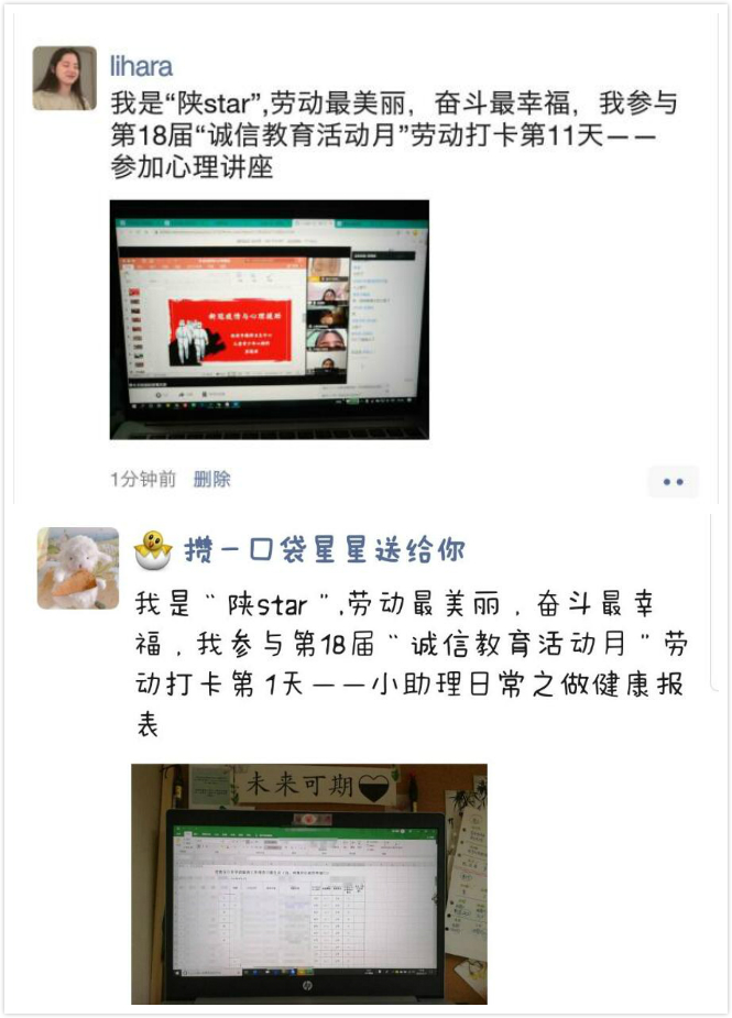 相关活动要求将本次诚信主题教育活动般到线上,开展了主题相关系列活动。系列活动由主题“云班会”、主题征文、主题作品创作、主题“云讲座”、“21天”诚信劳动打卡等五项独立的单项线上活动组成。各种活动有机结合,进一步深刻诠释了对诚信的理解,呼吁新时代青年学生将诚信精神内化于心、外化于行,努力成为弘扬诚信美德,争做诚信学子的践行者、推动者、示范者。