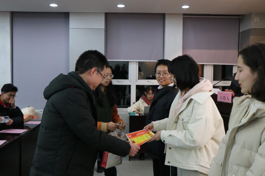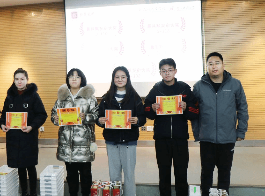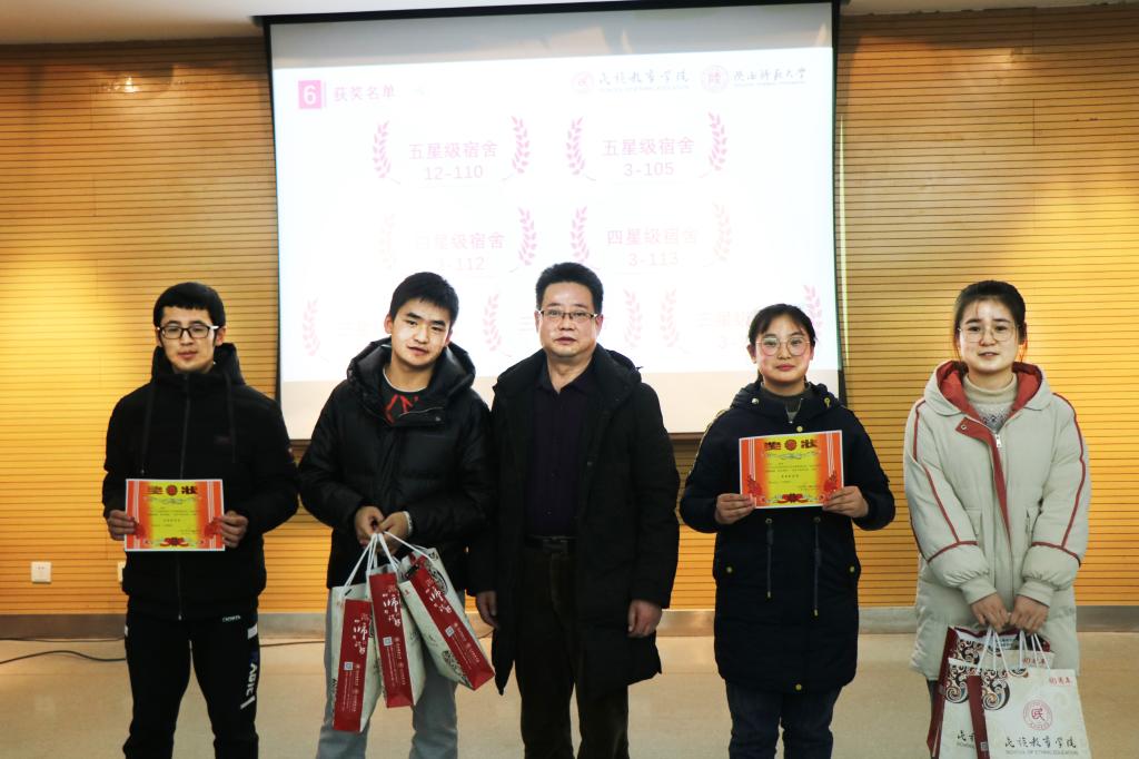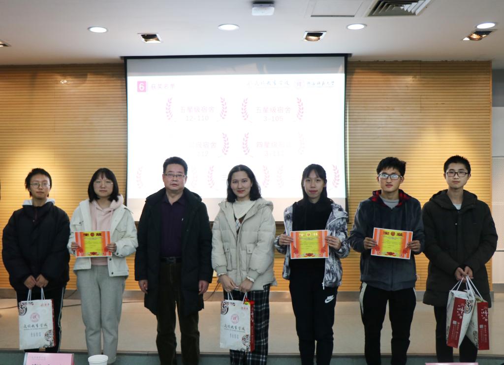 老师和学生代表向获奖宿舍代表颁发奖状及奖品并合影留念。