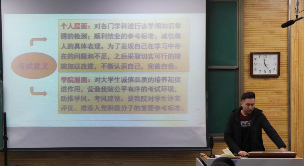 其次,专职辅导员热依木从考试时间安排、考试要求、缓考条件与流程等几个方面进行了详细说明,特别强调期末考试在个人层面和赌场老虎机