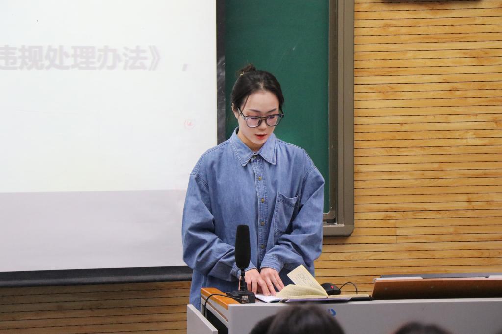 大会伊始,同学们观看了《国家教育考试考生诚信教育宣传片》,引起大家对诚信考试的重视。接着,兼职辅导员张雨带领学生重新学习了《学生手册》中关于“学籍管理实施细则”和“学生考试违纪、作弊处理办法”相关规定,向同学们详细介绍了什么是违纪、什么是作弊以及违纪作弊的相关处理和对个人未来发展的影响。兼职辅导员王雅丽宣读了《国家教育考试违规处理办法》,倡导同学们遵守纪律,诚信应考。
