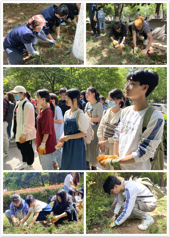 30余名学生在雁塔校区8、9号教学楼门前草坪开展锄地种草户外劳动教育实践活动。
