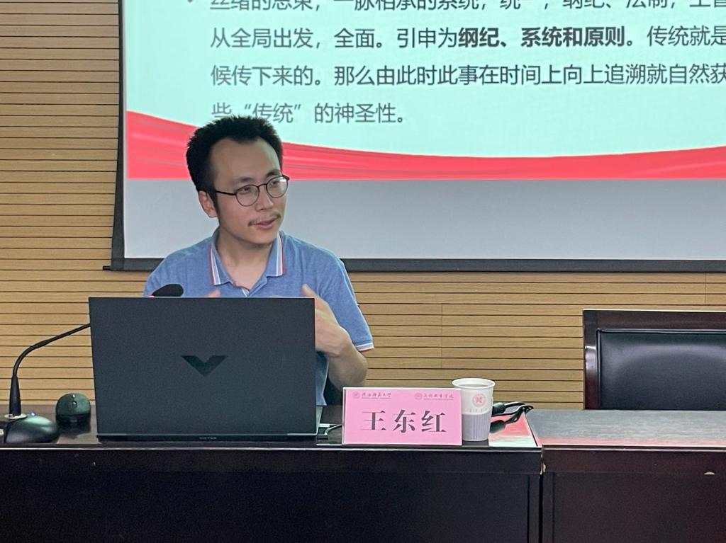 王东红副教授从习近平总书记系列重要讲话精神引入主题,提出新时代中国青年要“坚定不移听党话、跟党走”。首先,他阐述了党的光荣传统和优良作风形成的基本概念、经典表述、形成条件,讲述了其理论内涵和重要论述,同时逐条详细地解释了伟大建党精神的重要内容。其次,他从“不忘初心、牢记使命”这一终身课题出发,将伟大的建党精神与习近平总书记到民族地区视察讲话结合起来,与习近平总书记关于加强和改进民族工作的重要思想结合起来,与中央民族工作会议中的“十二个必须”结合起来,在传承和发扬党的光荣传统和优良作风中坚定信仰、坚守初心、知行合一,增强斗争意识,提高斗争本领,在战胜新的挑战的奋进中建功新时代。最后,他希望同学们要坚持敢于斗争、善于斗争的鲜明品格,锤炼斗争精神,增强斗争本领,深刻认识我国社会主要矛盾变化带来的新风险新挑战,勇于攻坚克难,奋力走好新时代的长征路。同时,要学习和发扬党的光荣传统和优良作风,提高政治站位、提升理论自觉、树立问题导向,坚持真学、真懂、真信、真用,推动学习往深里走、往实里走、往心里走。