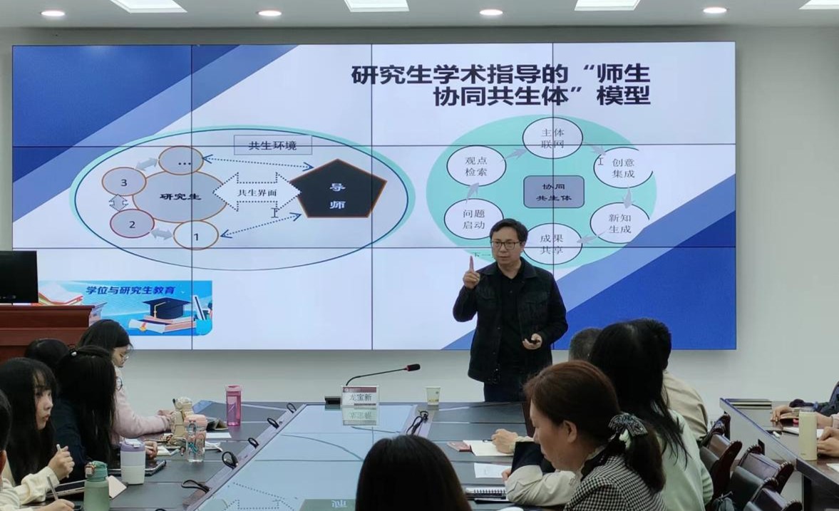 师生做了“新文科背景下教育学专业研究生培养模式创新的思考”专题报告。报告从“旧文科”现今面临的痛点出发,结合教育学人才培养工作现实需要,提出要在“新文科”这一背景下进行人才培养模式改革工作。龙宝新教授结合自身对研究生教学与培养经验,对“悟Class”课堂创建、“师生协同共生体”模型、“MSC”陈述结构、四大学术创新原理、研究生百字小结以及研究生论文指导全过程思维导图进行了分享。龙宝新教授领衔的研究生导学团队秉持“学术为本、幸福为要”的价值指针,奉行“实践出真能”学术训练思维,倡导关爱、体谅、拼搏的团队文化,致力于增强团队凝聚力、学术力与教育力的培育观念对研究生学术培养发展、水平提升产生了一定影响。龙宝新教授的倾囊讲授,获得了该院师生的赞赏与肯定。