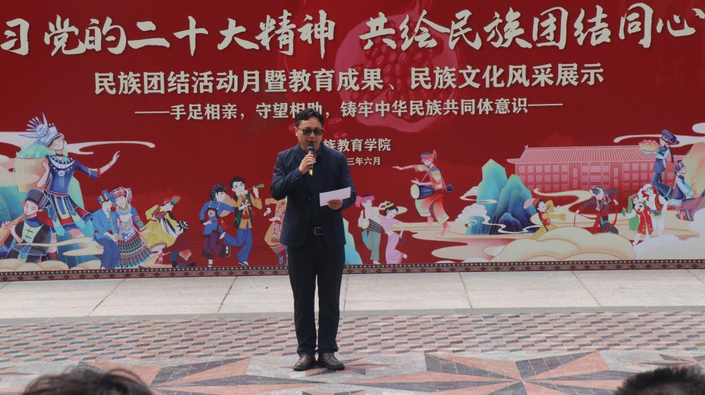 深入推进民族团结进步创建工作的一项重要举措。民族团结活动月的开展为广大学生展示自我、表达自我提供了舞台;也为促进全校各民族师生深入了解、深入交往搭建了桥梁。他寄语同学们,要充分认识本次活动的重要意义,在展示中促交流、在交流中促融通、在融通中促团结,深刻理解党的二十大精神重要内涵,铸牢中华民族共同体意识,真正做到共绘民族团结同心圆!
