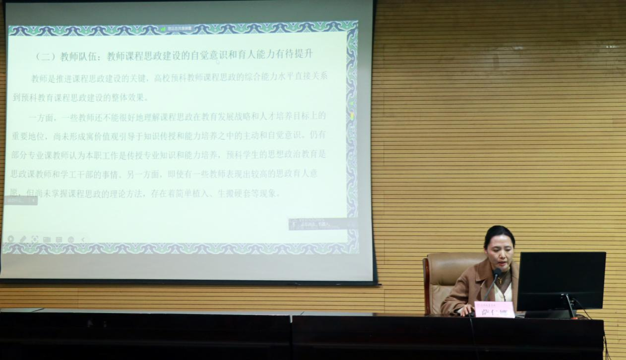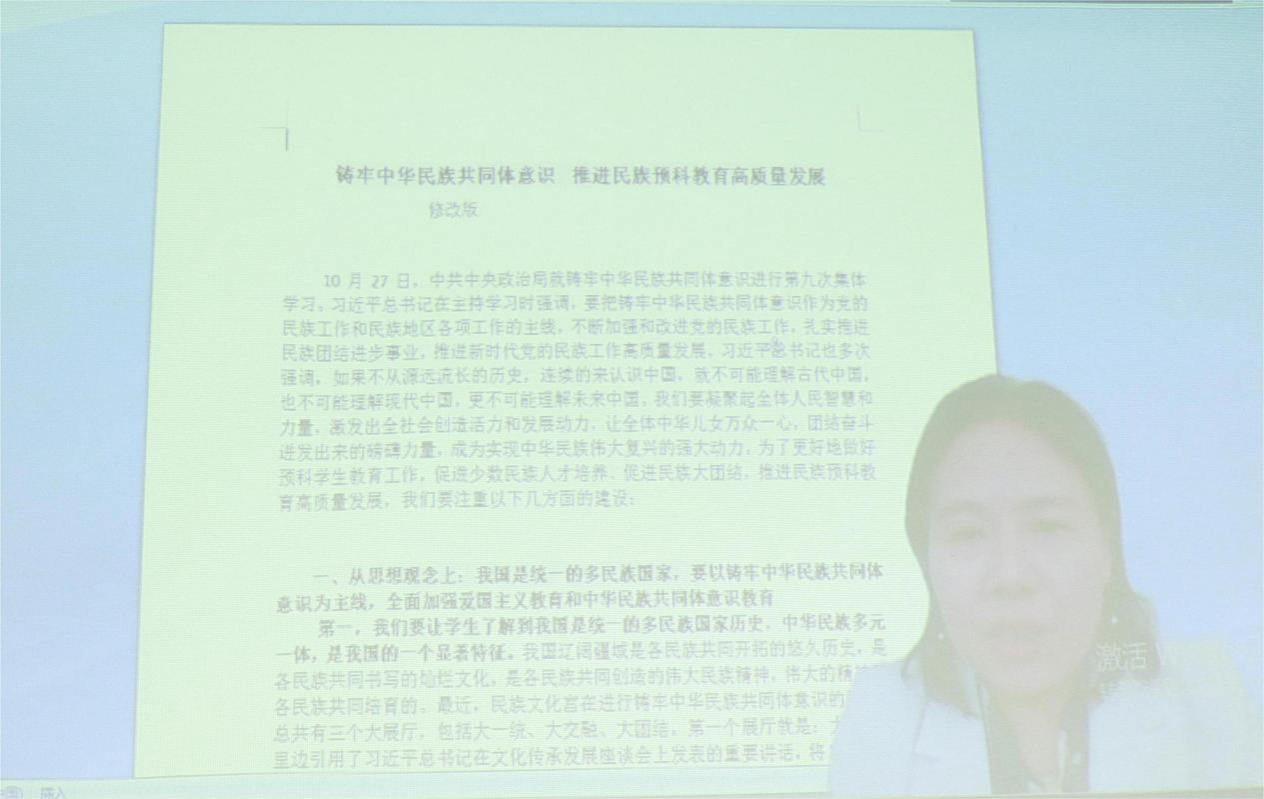 教师萨仁娜以课程思政建设为出发点,做了《高校民族预科课程思政助推铸牢中华民族共同体意识:现实困境与实现路径》专题报告,着重阐述了如何开展“课程思政”建设,有效铸牢预科学生中华民族共同体意识,使之成为新时代提升高校少数民族预科教育质量、人才培养能力的重要抓手。
