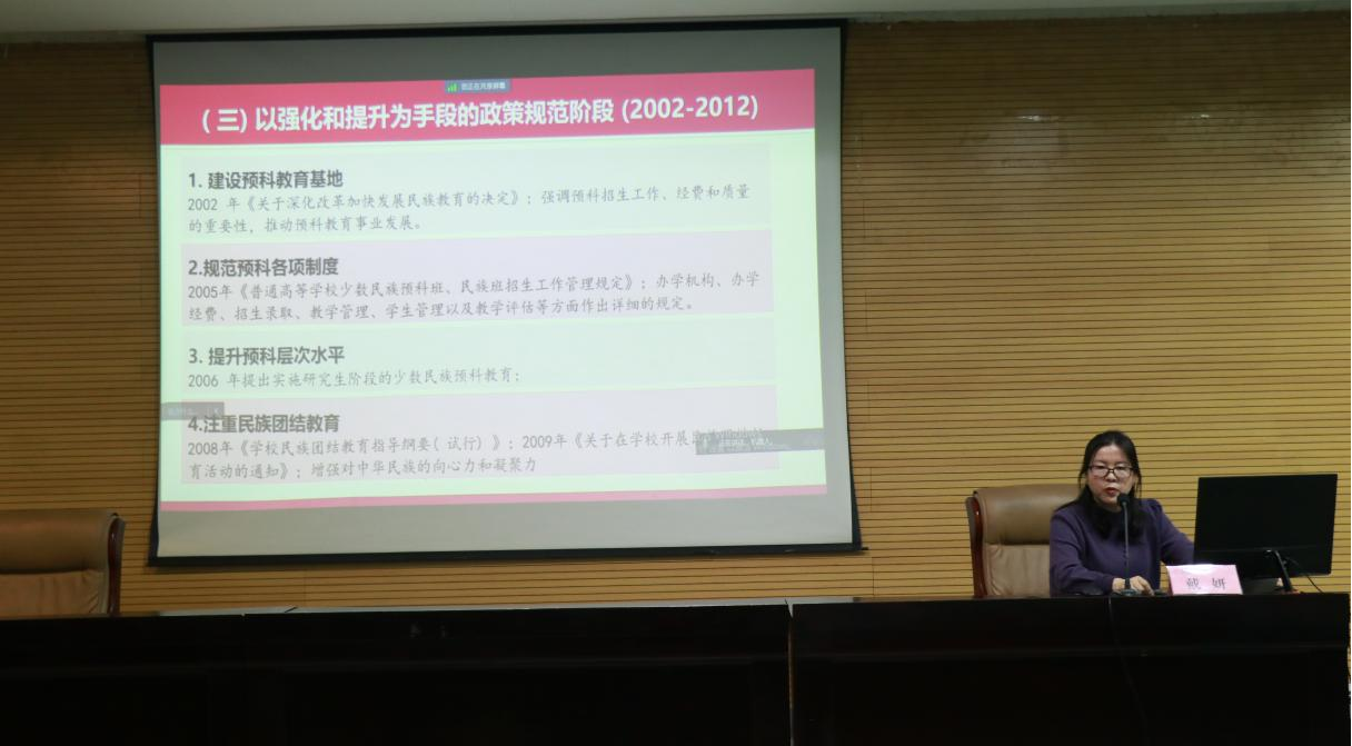 教师戴妍抓住国家政策脉络走向,作了《我国民族预科教育政策的发展历程、演进逻辑与未来走向》的专题报告。报告指出,高质量民族预科教育应完善以简政放权为核心的政策动力机制、追求以多元价值为旨归的政策目标取向、强化以督导评估为抓手的政策实施过程,构建多元参与为主体的预科教育政策话语体系。