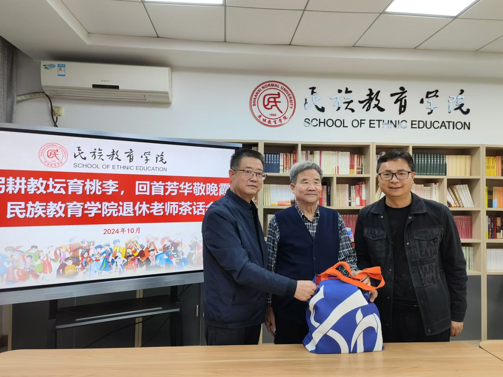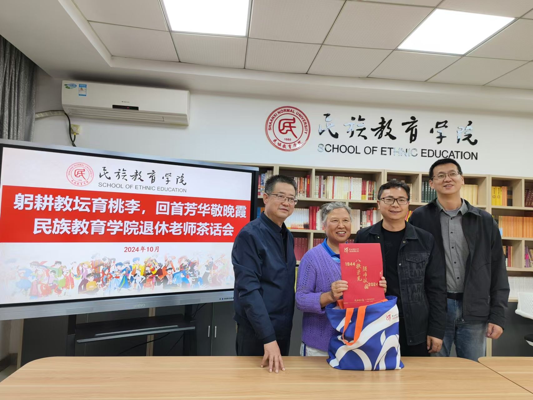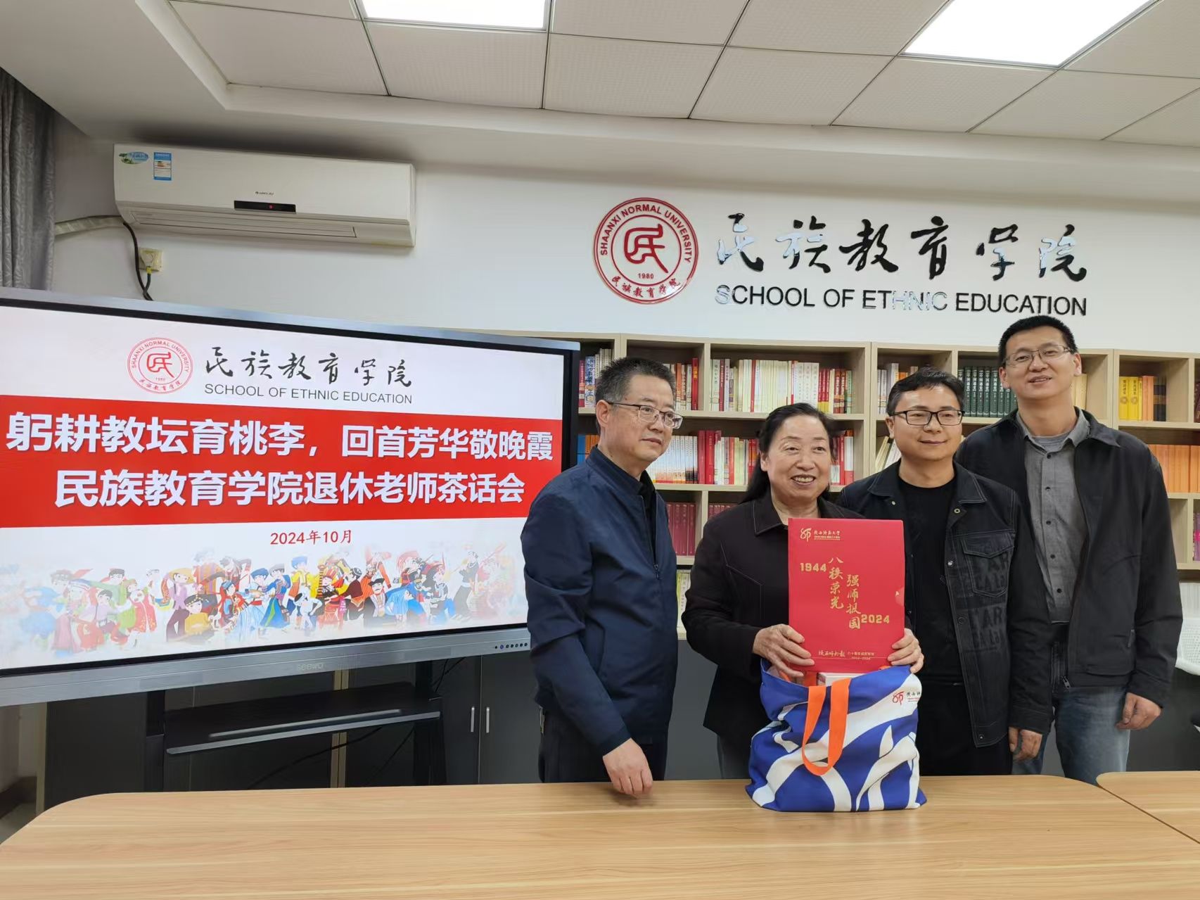 对退休老师们的敬意和感激之情。退休老师们欣喜地接过纪念品,脸上洋溢着幸福的笑容,场面温馨动人。