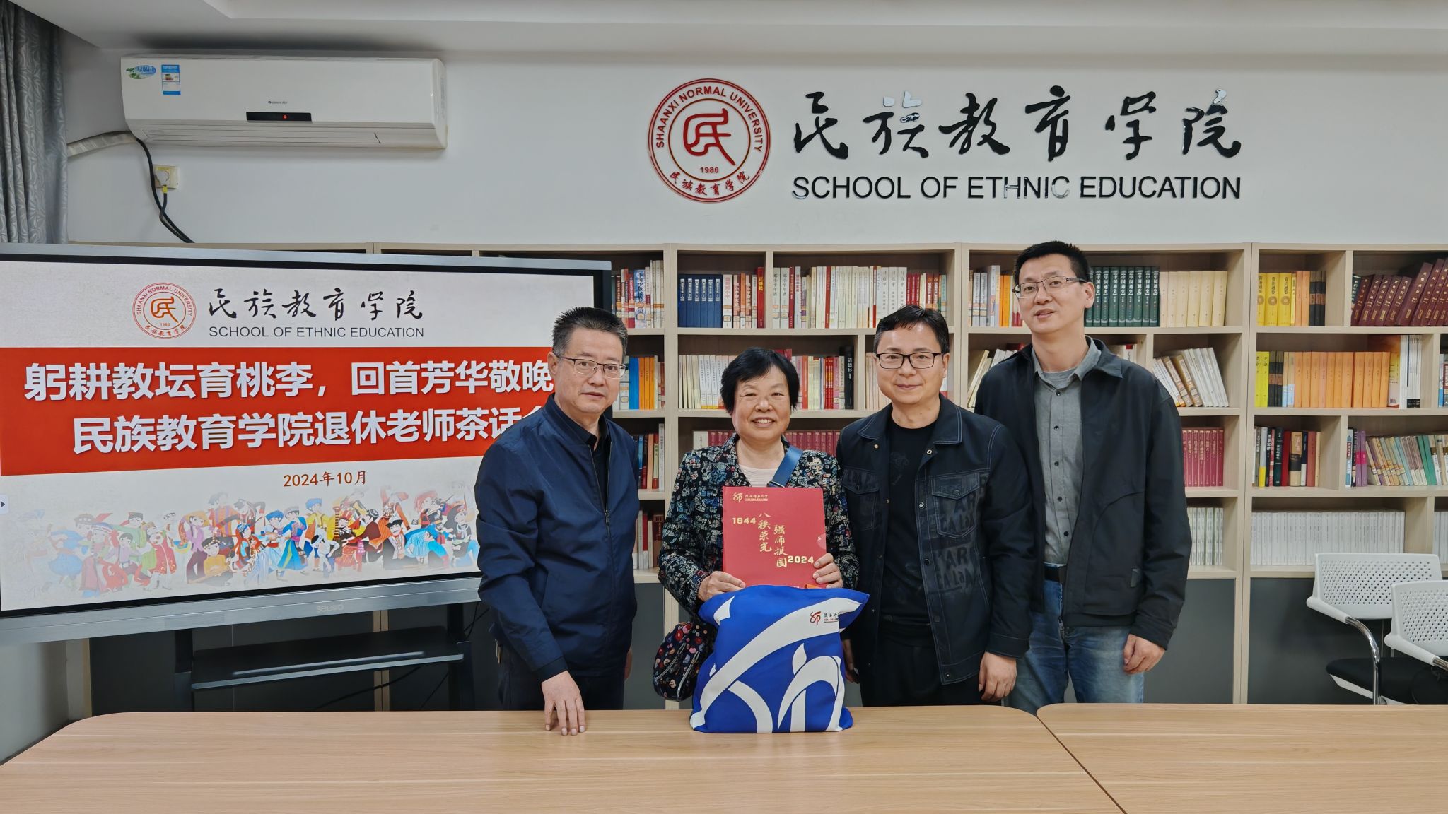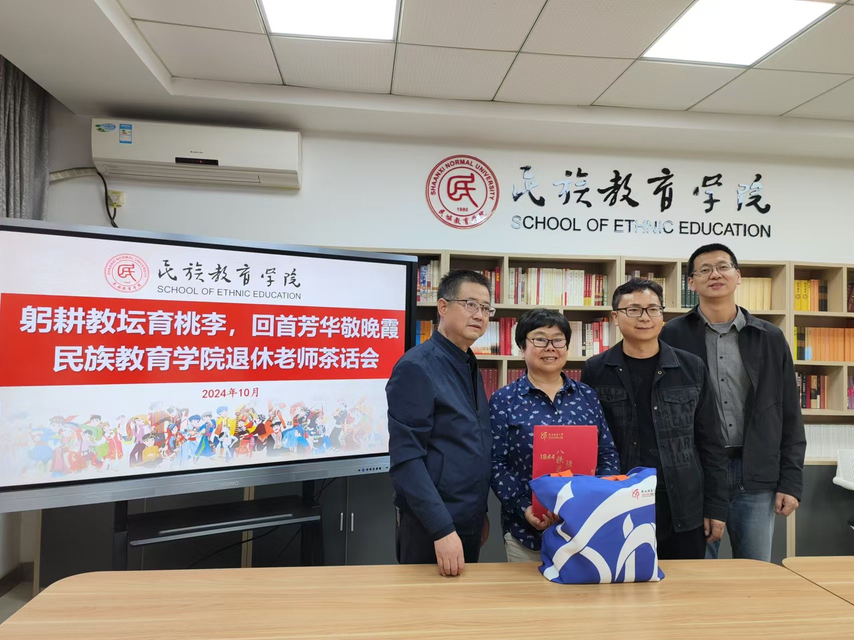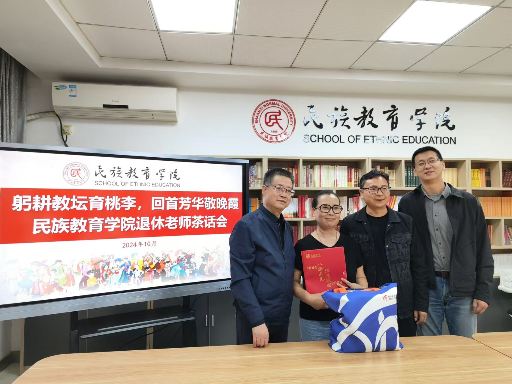 对退休老师们的敬意和感激之情。退休老师们欣喜地接过纪念品,脸上洋溢着幸福的笑容,场面温馨动人。
