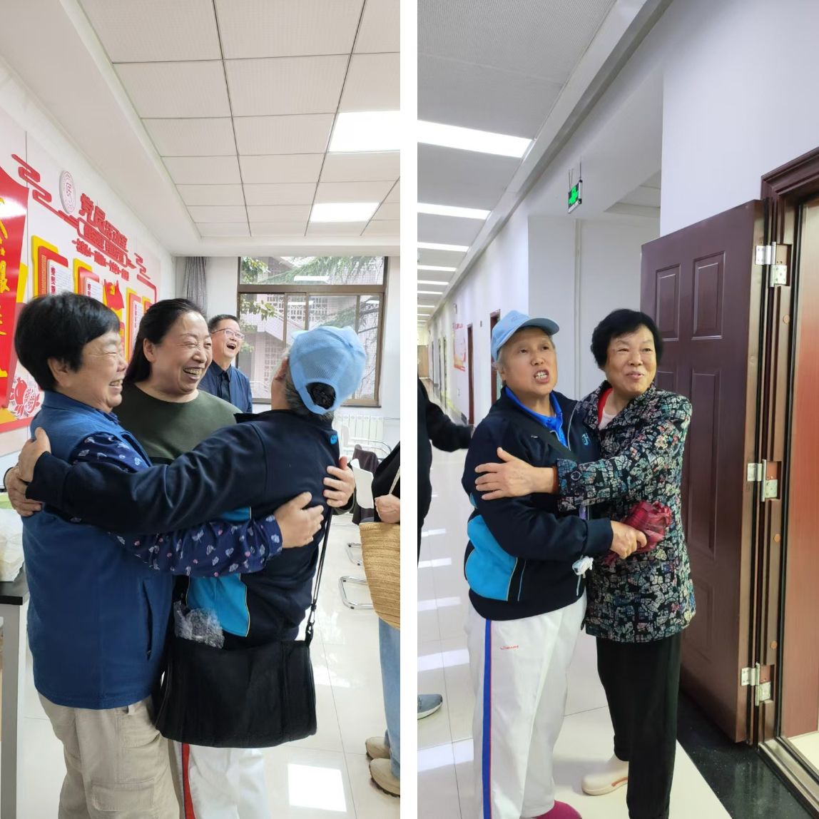 久别重逢的退休老师们相见欢喜,热情拥抱,场面温馨感人。