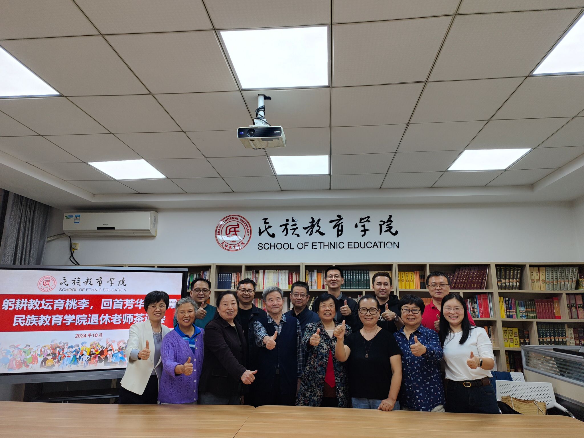 活动结束时,全体与会人员在会议室内合影留念。退休老师们与现任教职工齐聚一堂,共同竖起大拇指,展现出对赌场老虎机