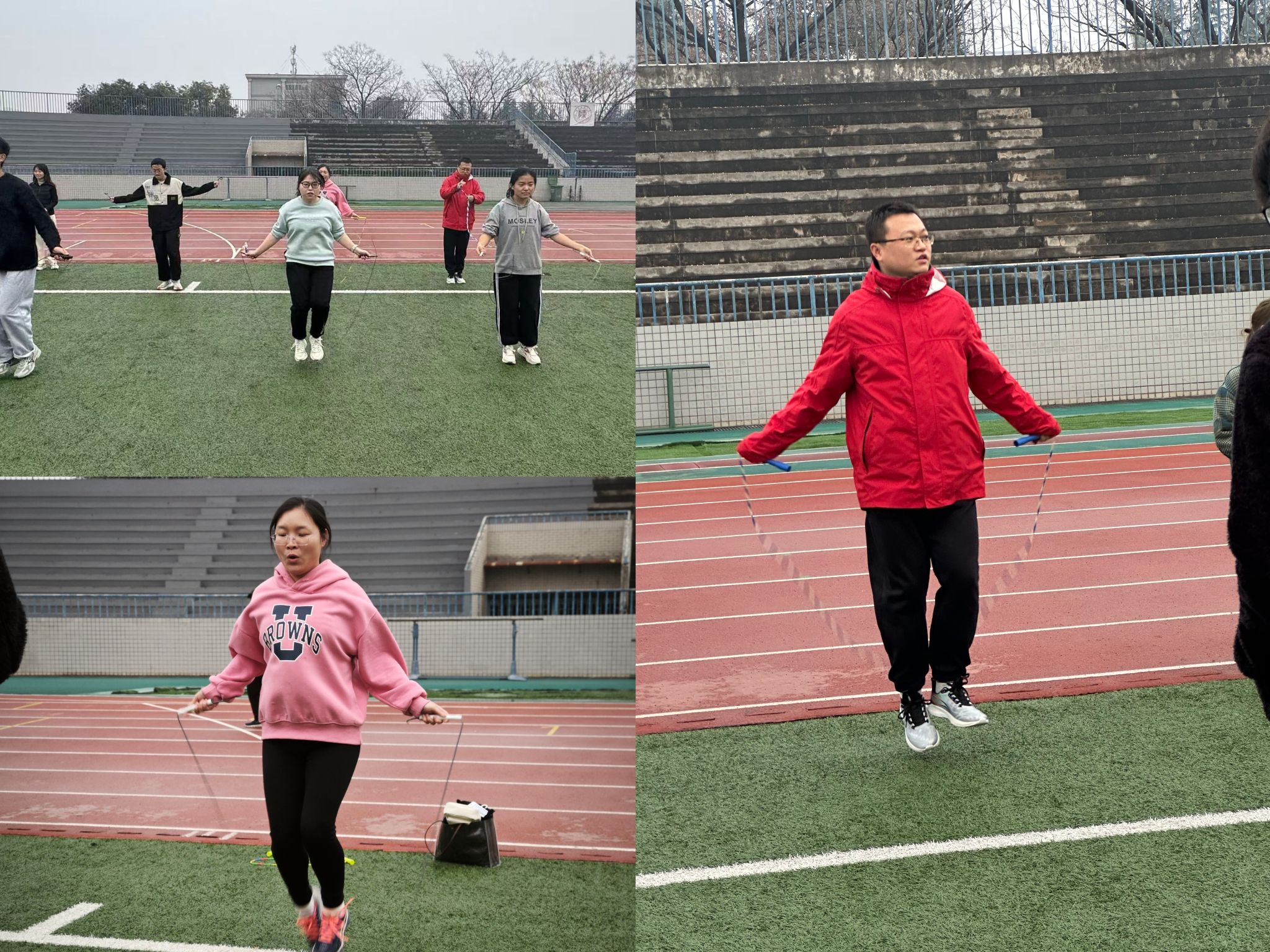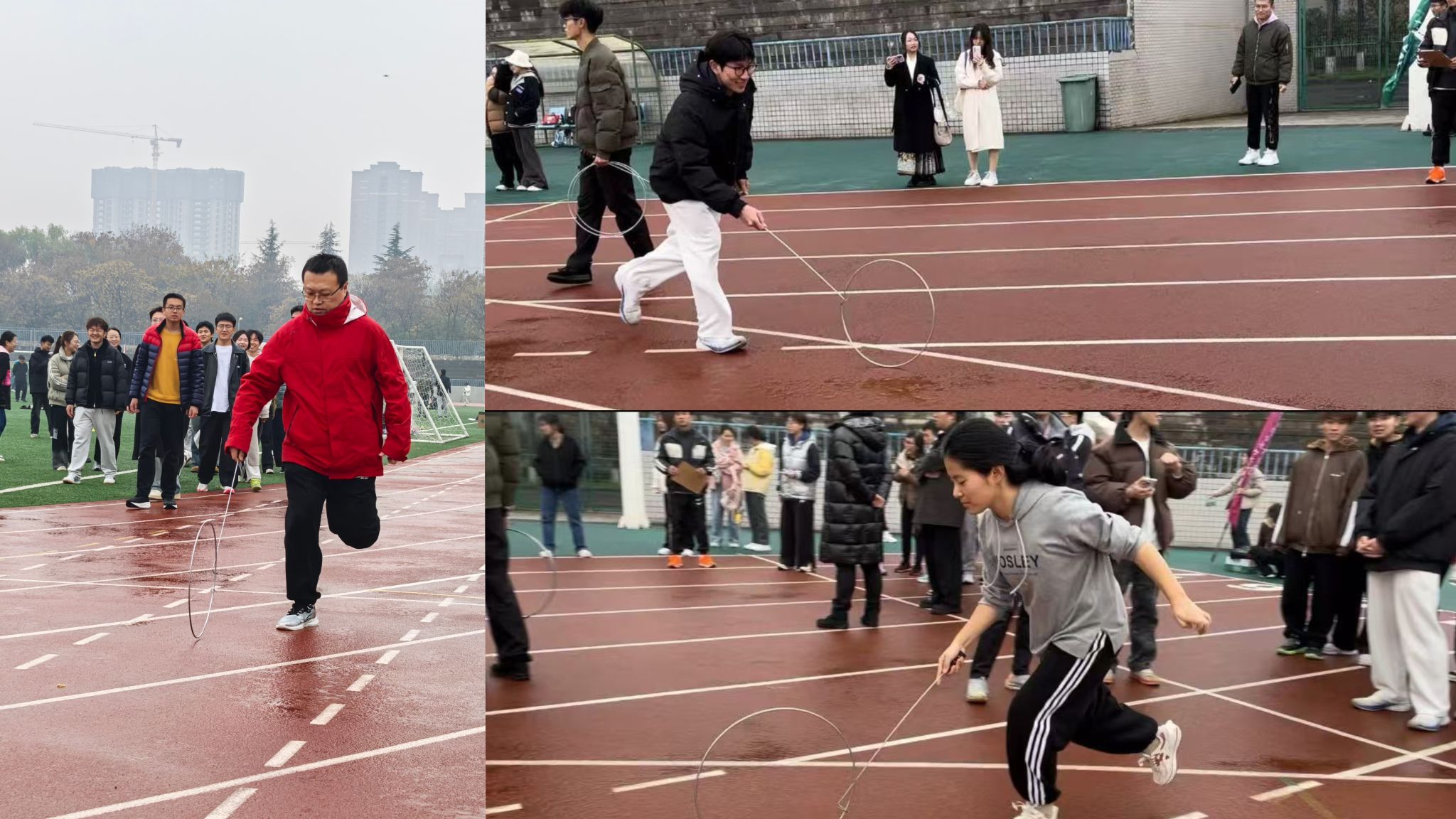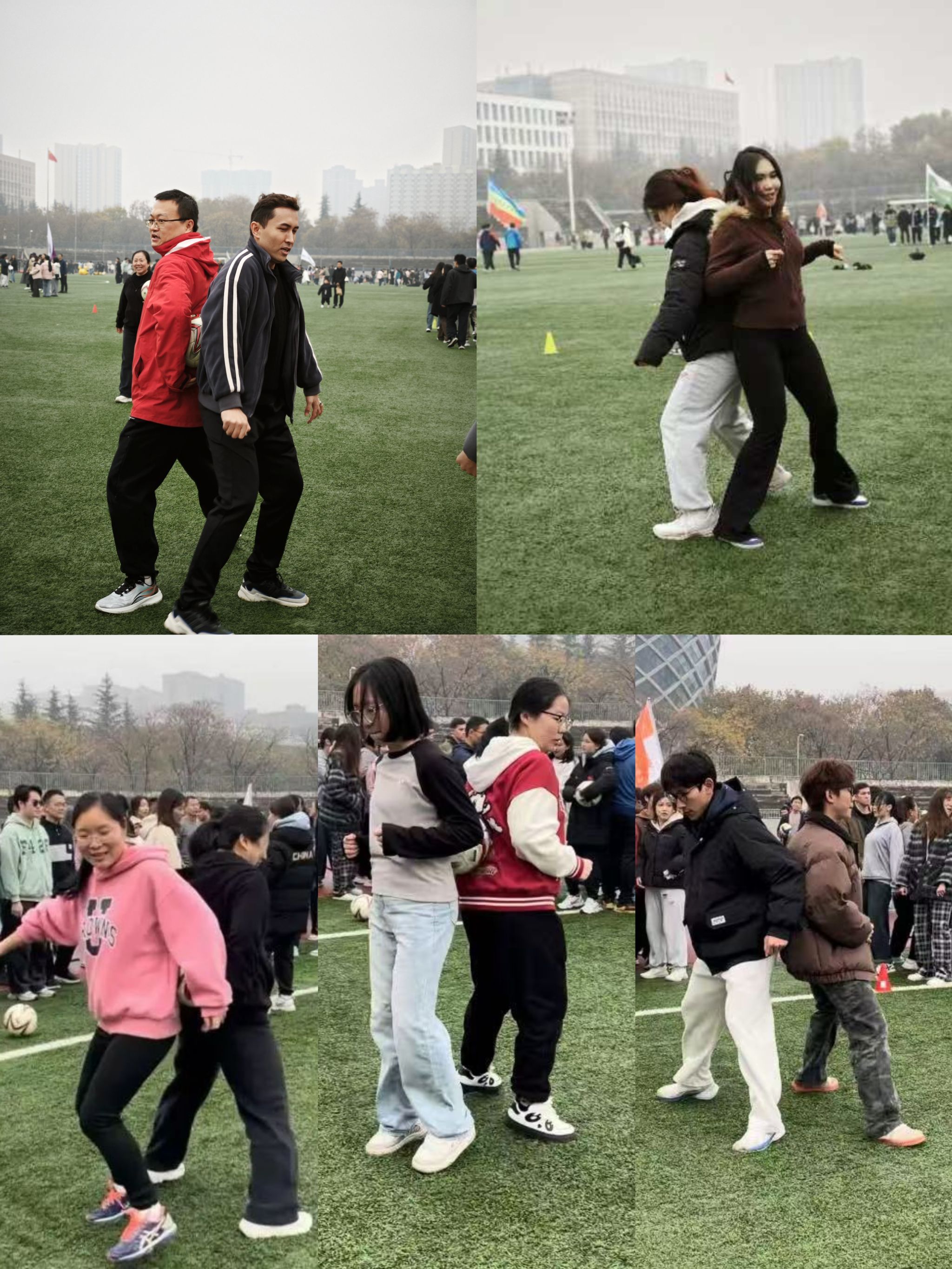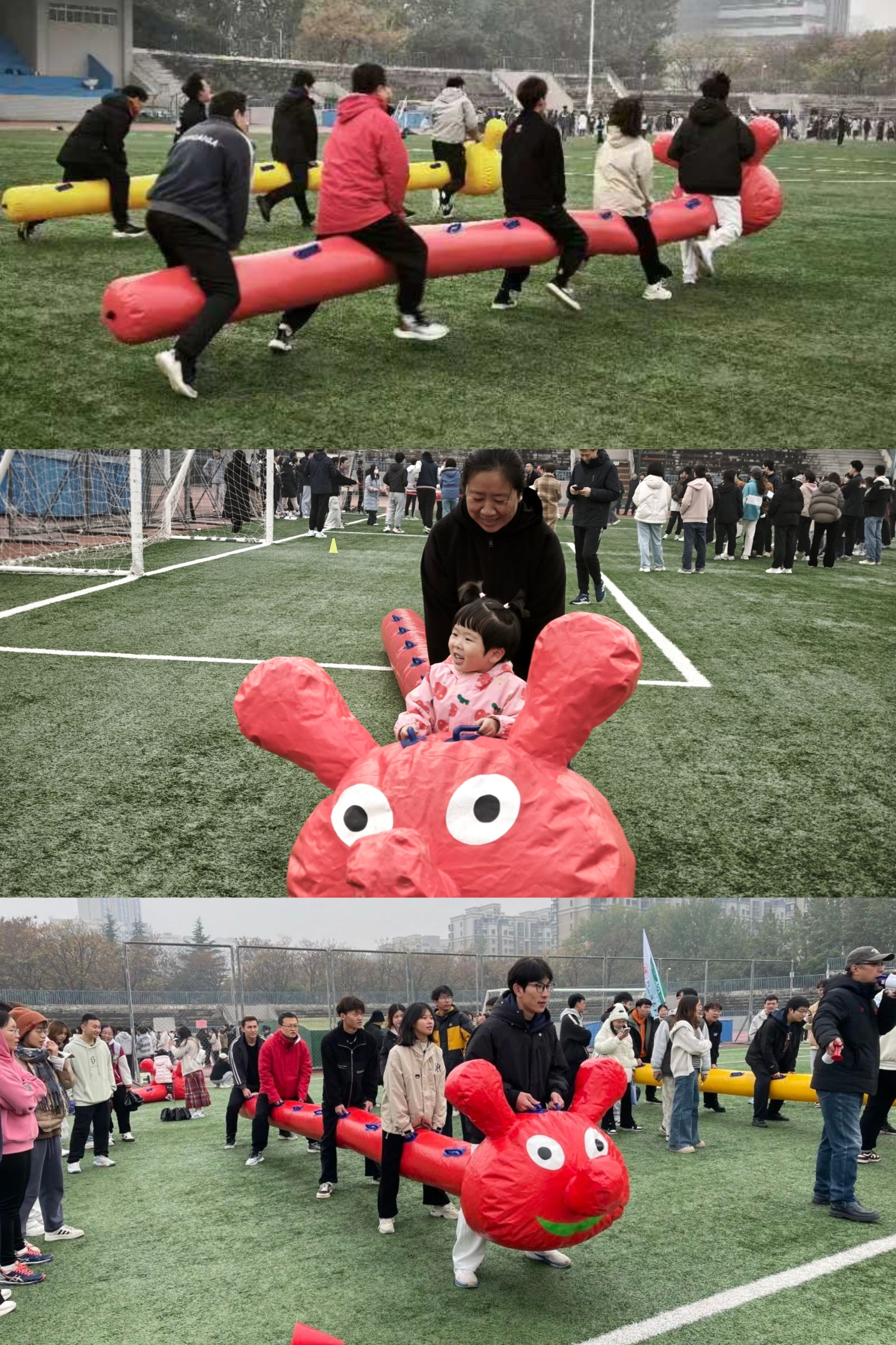 接下来的图片依次是赛前热身、推铁环接力、背对背夹球接力、小绳单摇接力、击鼓颠球、合力筑塔、毛毛虫竞速。
