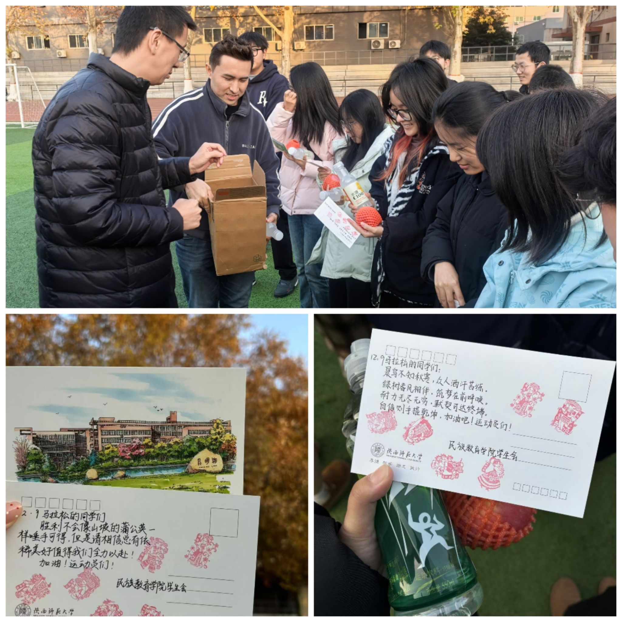 党总支副书记高冬,团委书记、专职辅导员热依木·努尔麦麦提,兼职辅导员刘江珊前往训练现场,向运动员们强调了赛事安全事项,为他们加油鼓劲,并向运动员们分发印有专属印章的纪念品。现场氛围热烈,运动员信心十足,蓄势待发。