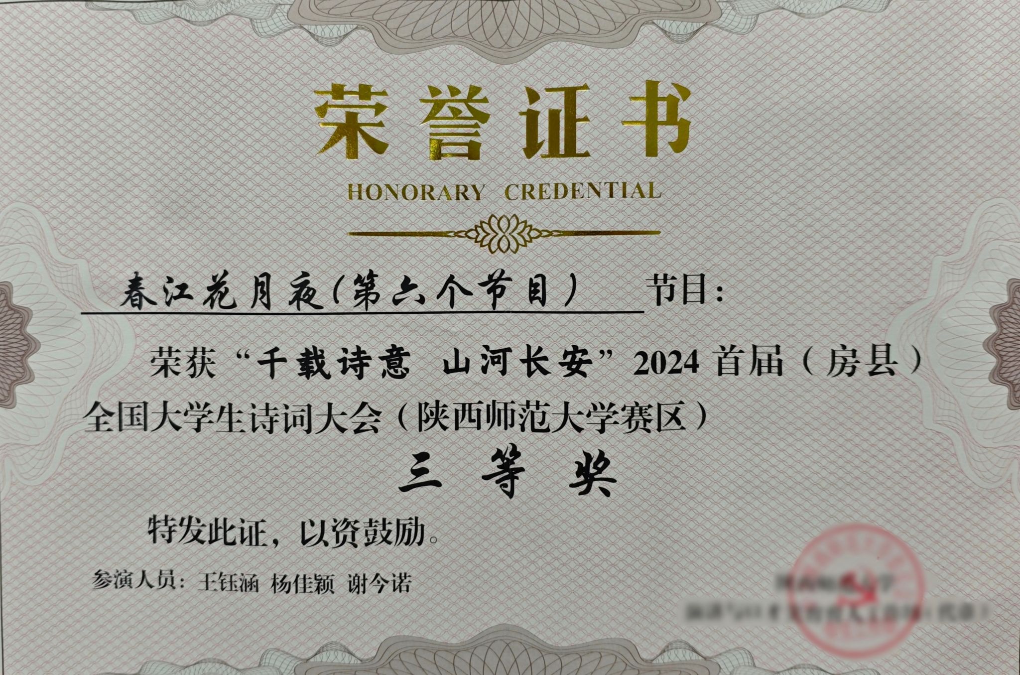 预科1班王钰涵、杨佳颖、谢今诺团队朗诵作品《春江花月夜》荣获三等奖。