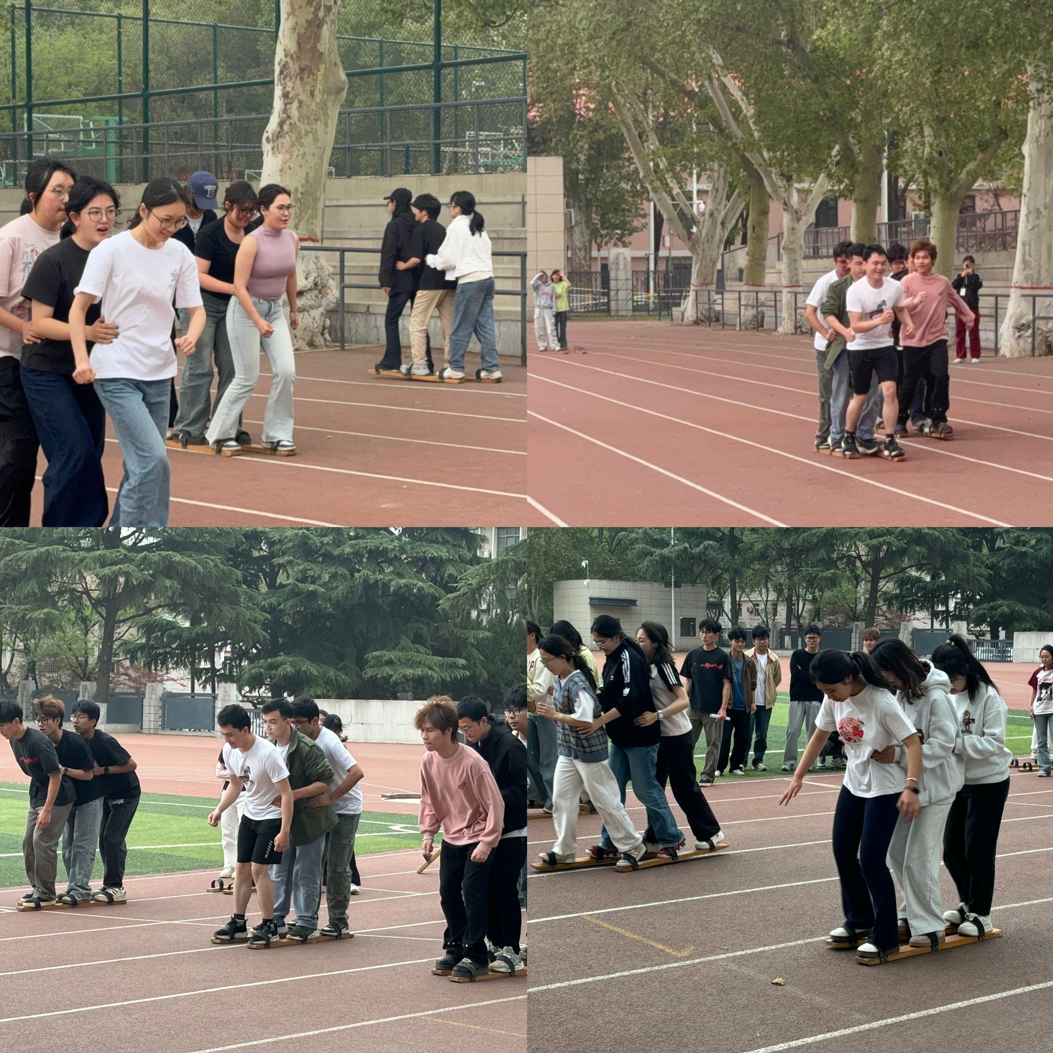 板鞋竞速是本次体育系列活动中极具民族特色的项目。三人一组,同穿一双板鞋,喊着整齐的口号,迈着一致的步伐向前奔跑。这不仅需要同学们具备良好的协调性和节奏感,更需要彼此之间的高度信任和默契配合。赛场上,各民族同学齐心协力,你追我赶,展现出了顽强的拼搏精神和团结协作的能力。板鞋活动让同学们在体验民族传统体育魅力的同时,也增进了对不同民族文化的了解和认同,体现了民族特色与体育精神的完美结合。