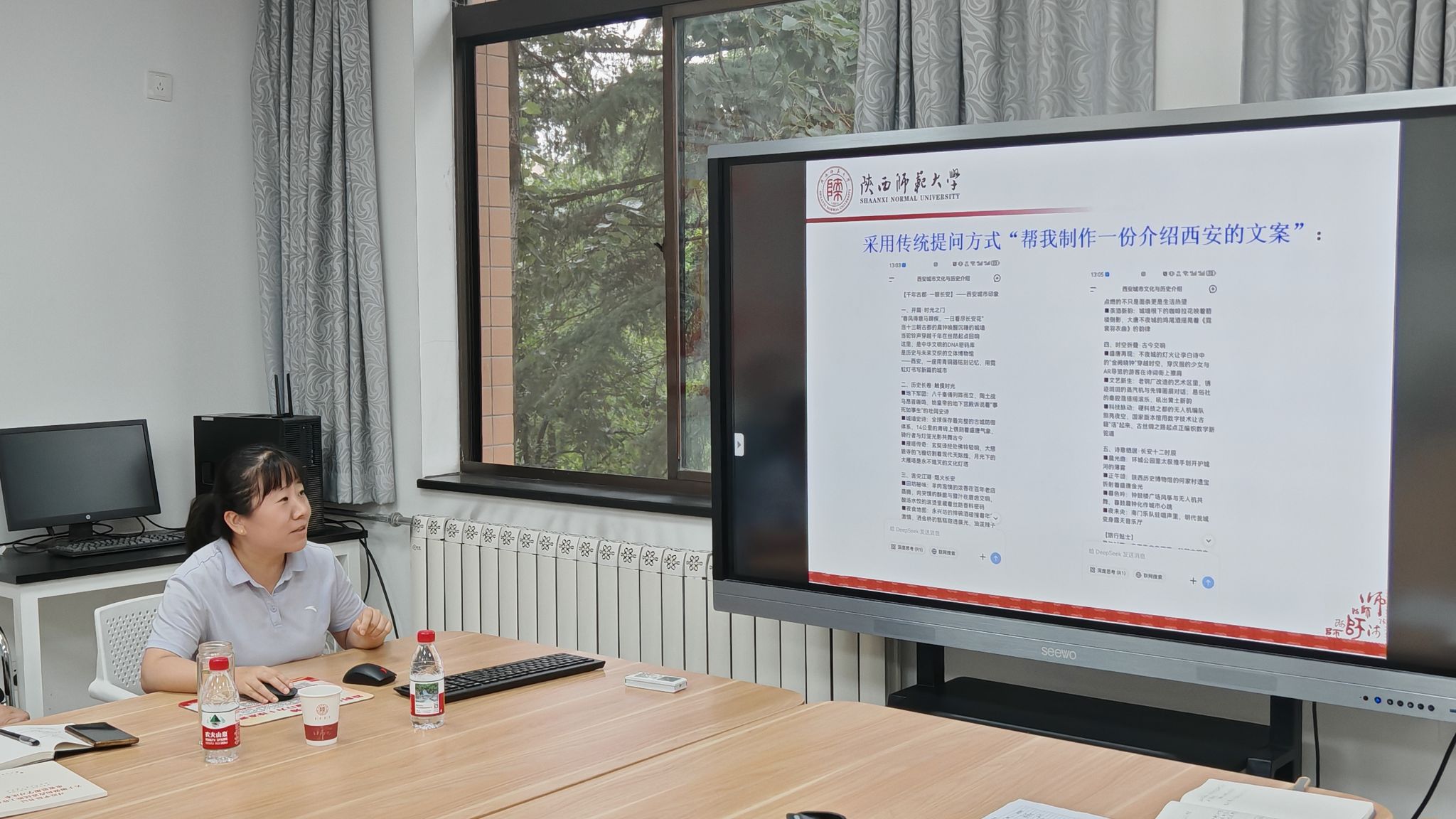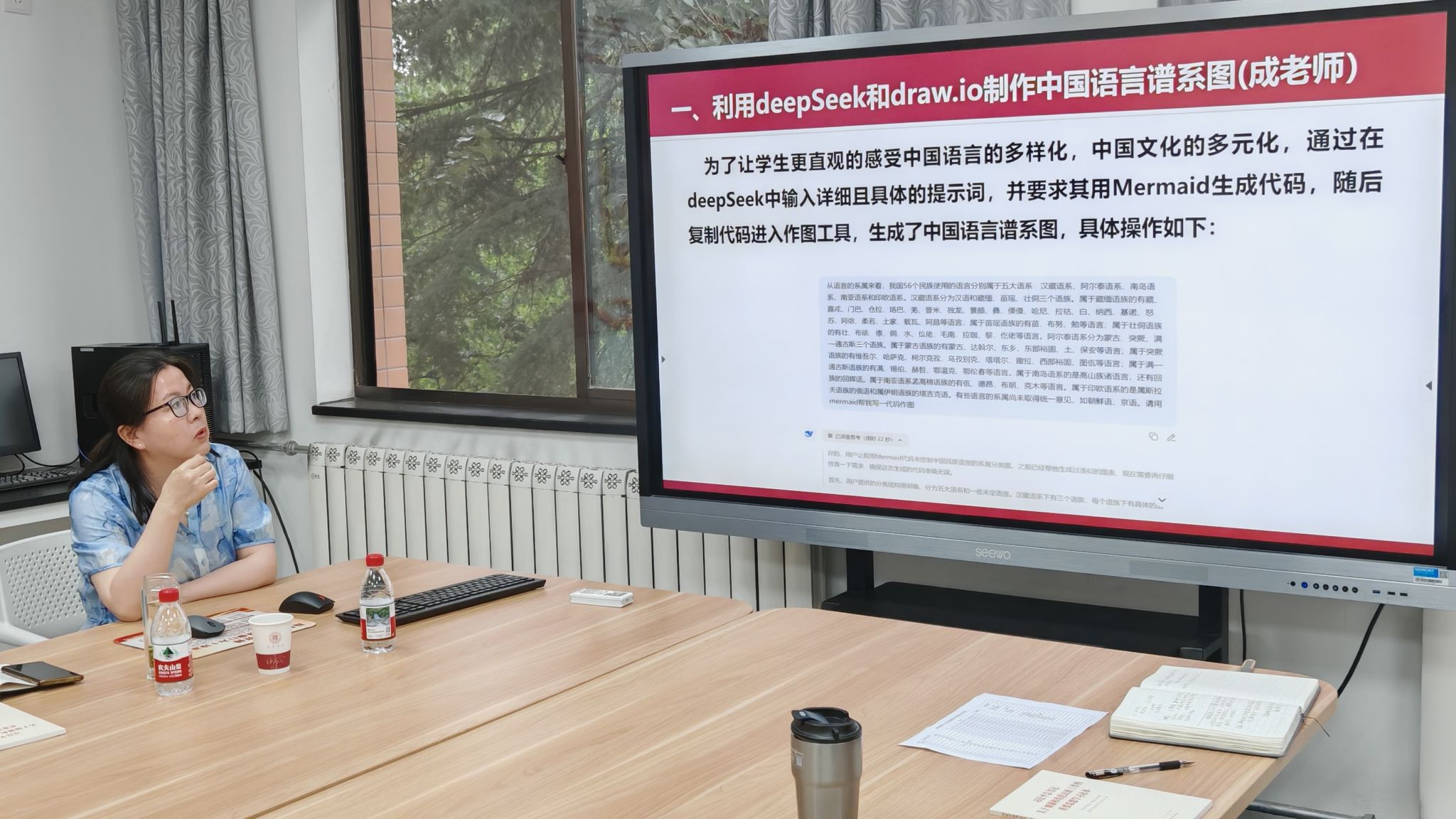 理科教研室主任王文华重点演示了DeepSeek在智能课堂管理(随机点名)、教学评价改革(智能批改)、个性化学习支持(一键出题)等方面的创新应用情况; 文科教研室主任卢静以《四方食事》教学设计为例,展示了AI在文本分析(多风格内容生成比较)、跨文化实践(AR菜单设计)等教学环节的有机融合案例;民族教育教研室主任戴妍介绍了教研团队成果,包括运用DeepSeek工具绘制中国语言谱系图、融入《中华民族共同体概论》课程教学、智能生成辩论素材等特色实践案例。