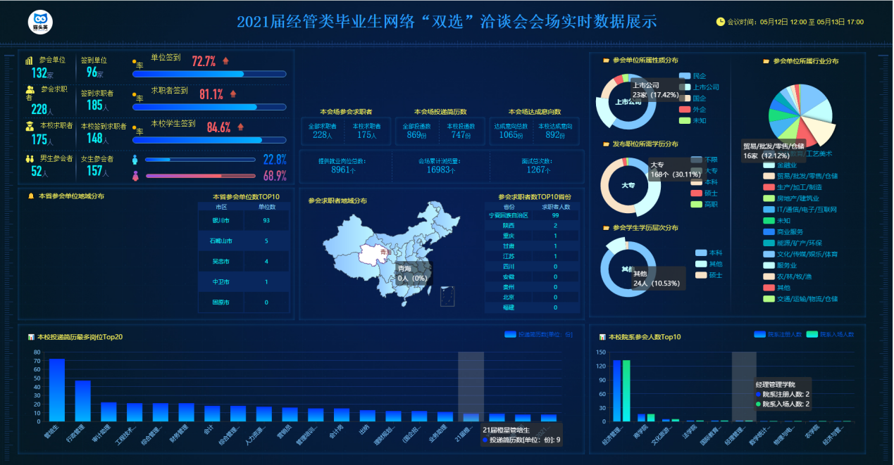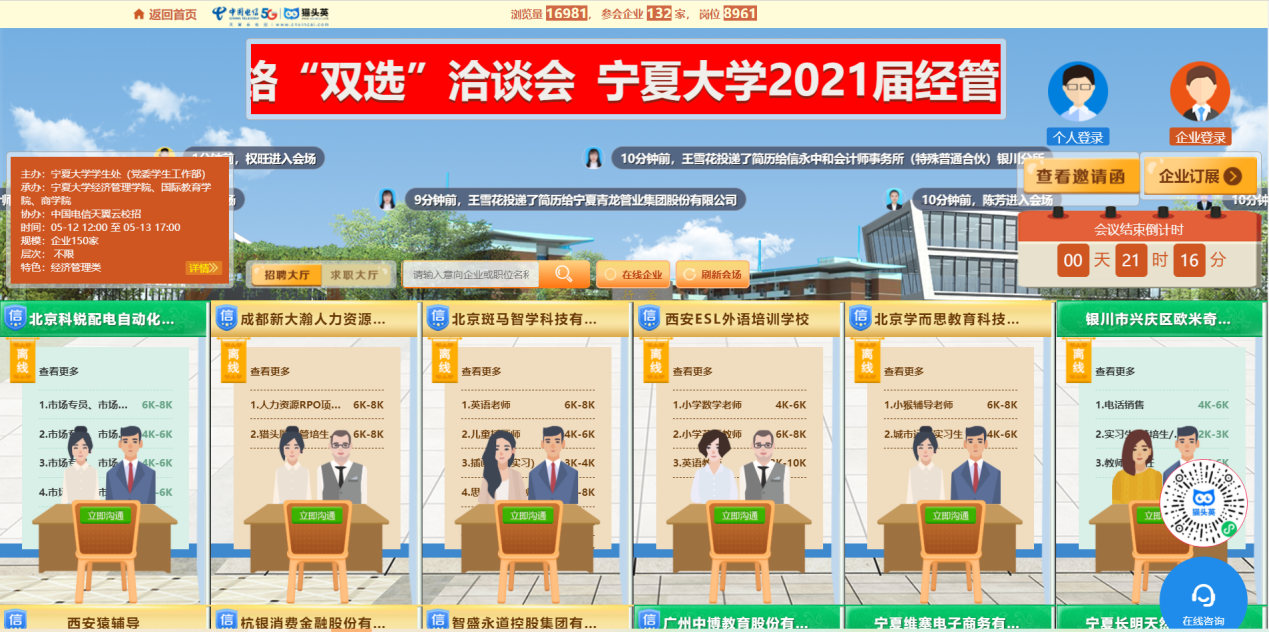 2021届经管类毕业生网络“双选”洽谈会,为用人单位和毕业生提供“云端”相会、求职招聘的平台。截止下午6点,共有132家用人单位参会。