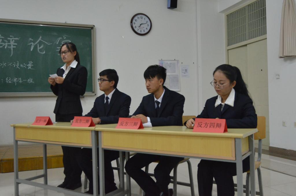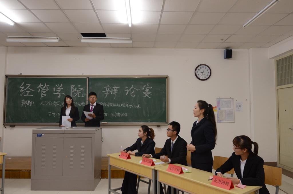 半决赛分两场进行,第一场是工商管理班与经济学一班就大学生用水是否应当收费各抒己见,第二场是物流管理班与电子商务班就人生自我实现的过程与结果孰轻孰重侃侃而谈。辩手们从多角度、多层次分析、理解、认识辩题,有条理性,有说服力地进行论述。尤其在自由辩论环节,参赛各队旁征博引,舌灿莲花,辩手们妙语连珠,气势如虹,展现了较之前更显高超成熟的辩论技巧,思路清晰,衔接默契,应对灵活,浑然一体,巧妙利用矛盾,攻其要害,迅速将赛场气氛推向高潮。值得一提的是,辩手们在整场辩论中表情手势自然大方,措辞表达幽默诙谐,实乃恰同学少年,风华正茂。引得观众反响热切,激情澎湃。最后,经过激烈辩论和公平裁决,第一场获胜班级为正方工商管理班,最佳辩手为反方经济学一班一辩刘恩杰,第二场反方电子商务班胜,反方三辩曙瓦克获最佳辩手。本次半决赛在观众的热烈掌声中圆满落下帷幕。