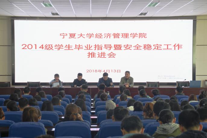 贺兰山校区文荟楼东报告厅举行“2014级学生毕业指导暨安全稳定工作推进会”,院党委副书记程胜利、学生工作办公室主任黄旭兴、新疆学生工作坊内派教师阿曼台、2014级辅导员何韶华出席会议。2014级全体在校生到场参加。