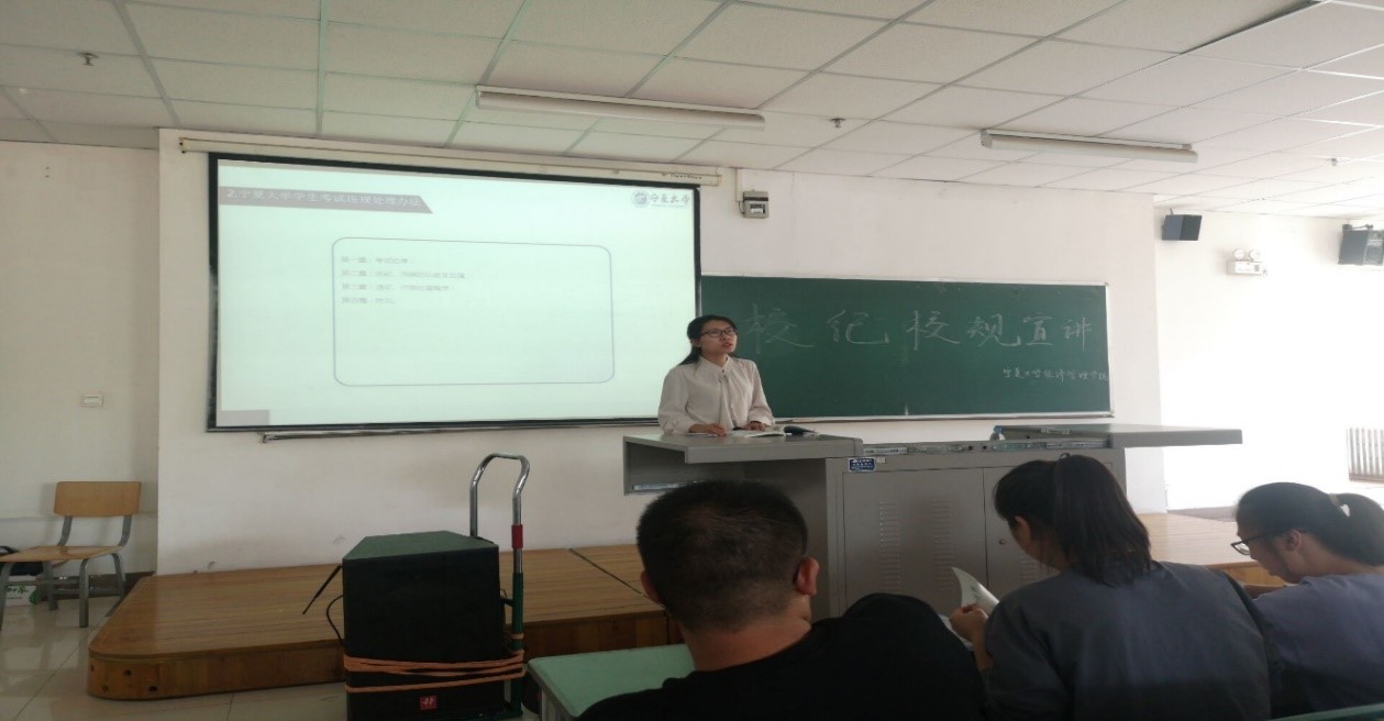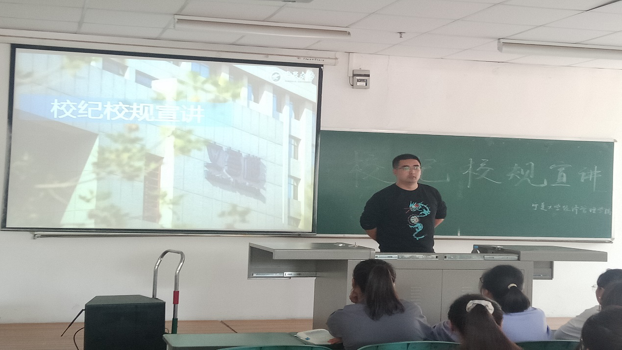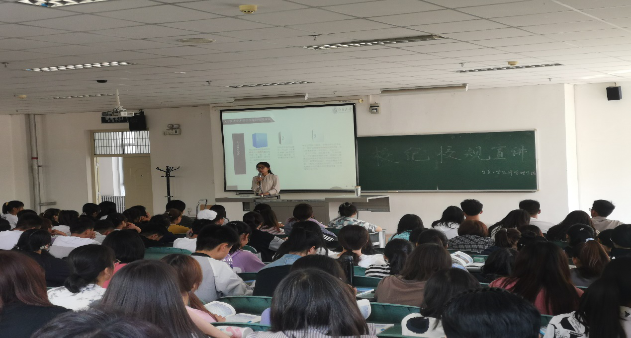 会议伊始,何韶华向同学们强调了校纪校规的重要性及学生手册考试相关内容。期间,何韶华向新生普及各种违纪行为及处罚措施等。