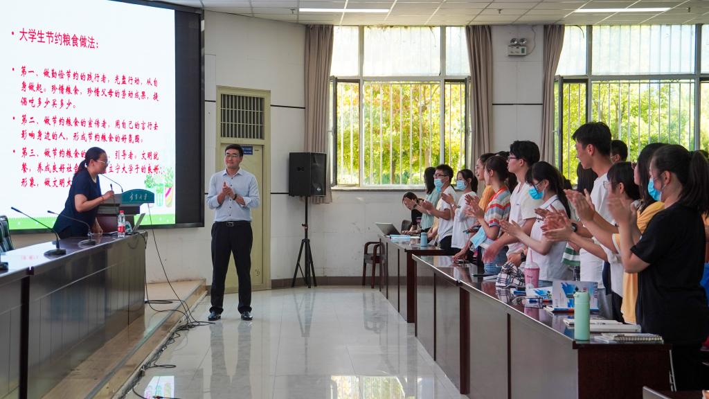 粮中有米,食中人良,一切皆有良,人用良食粮。张萌菁以粮食安全问题、粮食浪费现状、杜绝浪费三个方面为学生进行讲解。张萌菁以粮食生产供应的约束条件、我们国家的基本国情两个角度为学生讲解了保障食品安全的重要性,通过案例向同学们强调了居安思危的重要性,要永远绷紧粮食安全之弦。