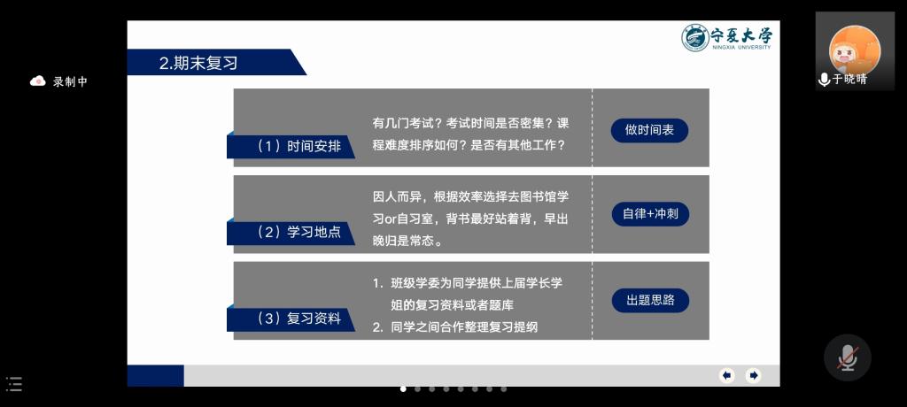 另一位国奖获得者于晓琴也向大家分享了自己的学习经验。于晓琴讲述了期末复习的相关问题。建议大家做好时间安排,有效复习,并且向大家系统性地介绍了高效率学习方法。她建议大家利用假期时间进行各项创新创业活动与计算机程序的学习,努力充实自己。