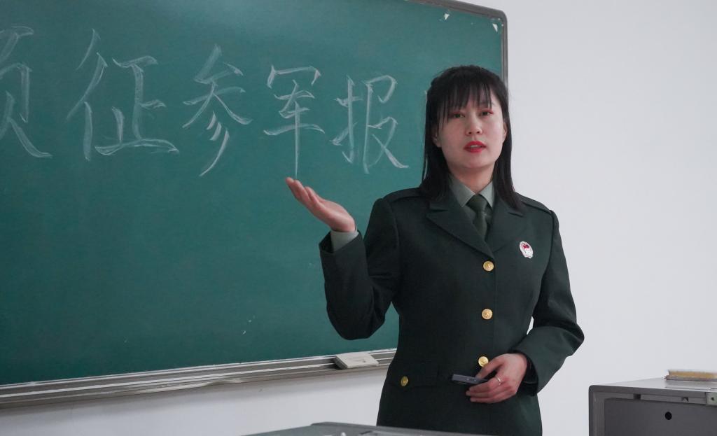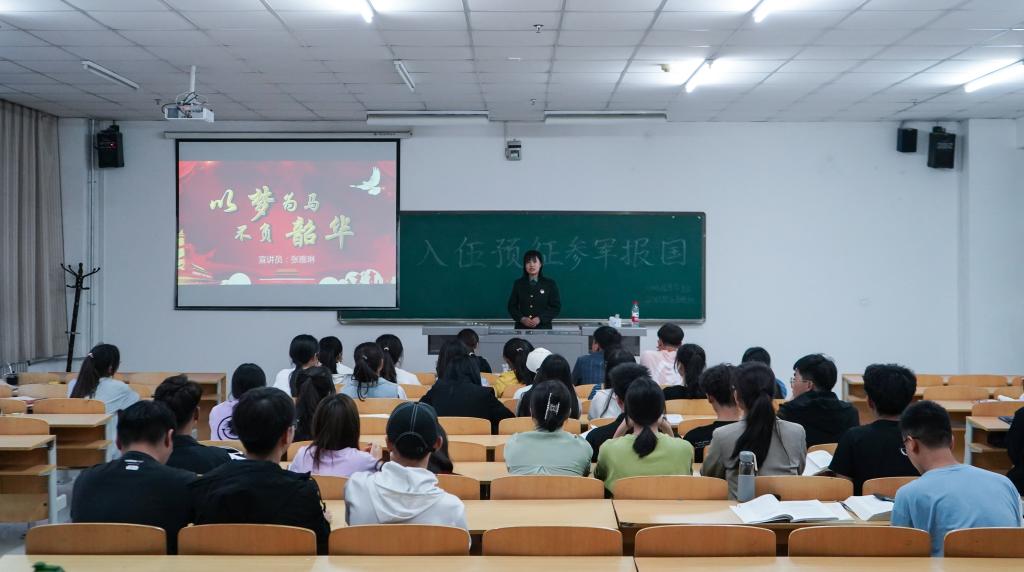 青春因磨砺而出彩,人生因奋斗而升华。张雅琳以一段视频向同学们讲述了自己的个人经历及感悟收获。她分享了初进新兵连时,军队的内务及严格的军规对她的挑战,战友的团结与鼓励让她坚定了初心与梦想,岗前集训感悟到的酸甜苦辣。关于应征入伍的流程和政策,张雅琳从应征入伍的年龄标准、身体条件、视力要求、兵役登记、应征报名及应征地选择等方面对大学生征兵入伍政策做了详细解读。提到优抚优待政策,她就尊崇优待、入伍发展、复学升学、经济补助、就业创业五个方面进行阐述,号召同学们携笔从戎,保卫国家。保卫国家终不悔,绿色军营献青春。黑学虎主要讲了征兵入伍的政治条件和有服兵役义务的公民的违法违规行为及其承担的法律责任追究。