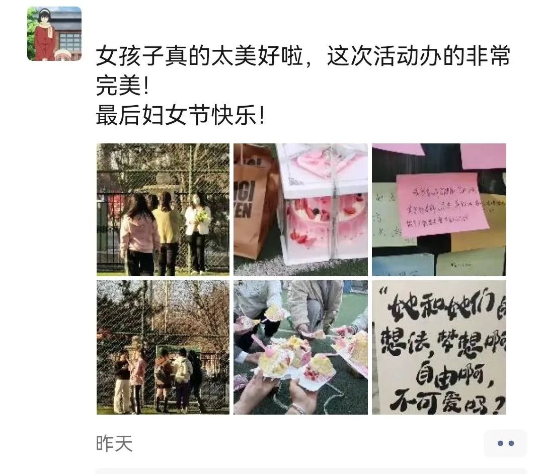 为了庆祝这个重要的日子,展现女生的风采。让女生的可爱、优雅、温柔、智慧、坚韧…如春天的花一样在这个万物复苏的时节绽放属于自己的光彩。在此次活动中,个个青春洋溢的笑脸与夕阳的余晖形成最美的光景。女生们纷纷写下自己最美好的心愿并且粘贴在小黑板上。做完这些还可以领到美丽的鲜花。在操场上,女生们有的唱着歌,有的捧着鲜花拍照,每个人的身影都显得那么美好。