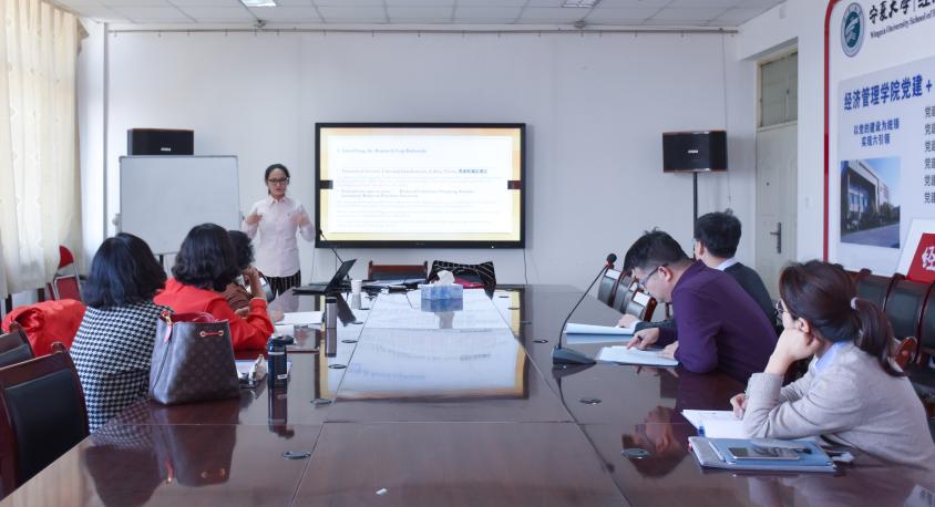 会议伊始,冯蛟对与会人员进行了简单介绍,并对吕靖的到来表示欢迎。在热烈的掌声中,吕靖开始学术课题的讲解,她的报告主要分为两个阶段,首先,她简略讲述了自己在读博期间的学术研究经历;而后,她以PPT展演的形式详细讲解了在英国实体零售店的个人购物过程中,智能手机的使用情况与消费者的预期满足感。在调研过程中,她对43名实体店消费者及英国某购物中心进行了开放式访谈,基于此,其对如何消除购物焦虑感提出了自己独到的见解。听完吕靖的报告后,在座的各位老师从中外市场比对、数据收集、文化差异等角度展开讨论,并就报告的相关内容进行交流。
