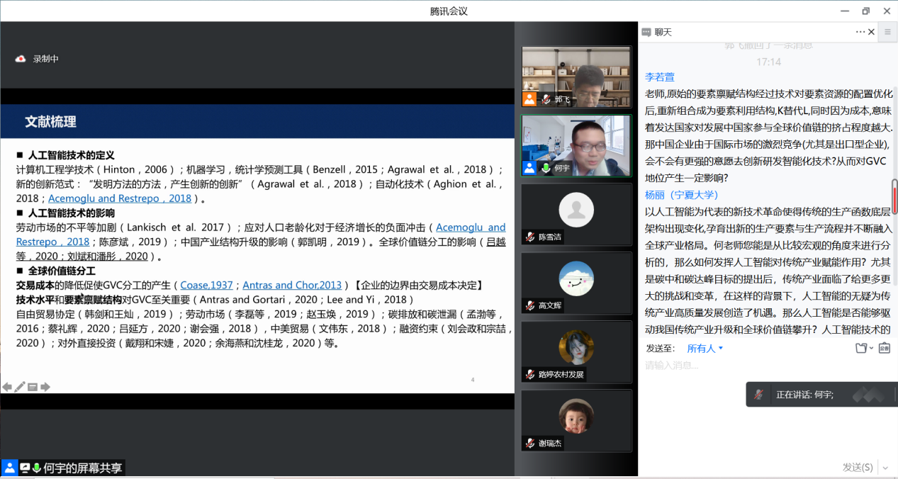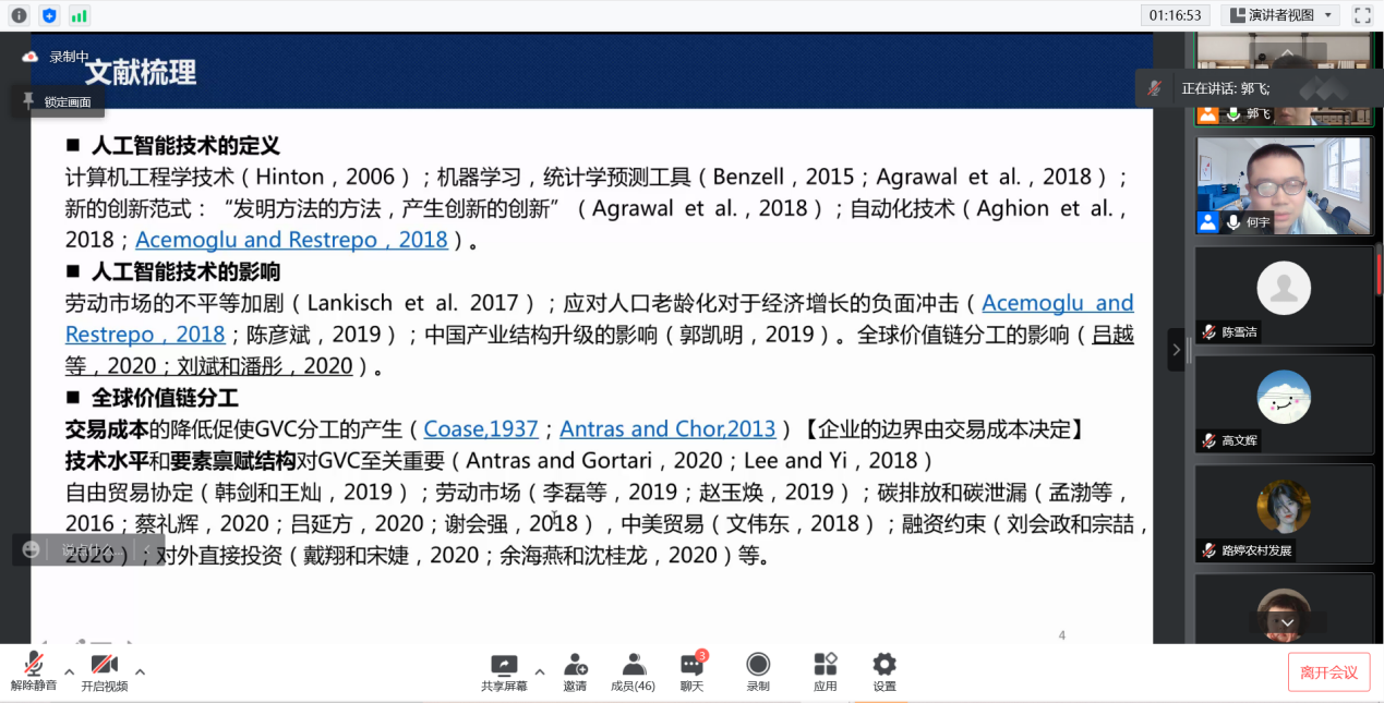 汇报结束后,听取汇报的师生学者与何宇博士进行了热切的讨论与交流,提出关于人工智能技术、全球价值链竞争、模型构建以及人工智能技术在双循环与技术要素驱动下的发展等众多问题,何宇博士对此进行了一一解答。