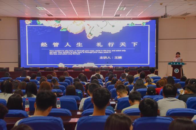 “经管人生、礼行天下”,环球礼仪商赌场老虎机 高级礼仪培训师王婧亲身示范讲授各类礼仪技巧,鼓励毕业生注重礼仪、践行礼仪,做一个礼行天下、富有仪式感的经管人。