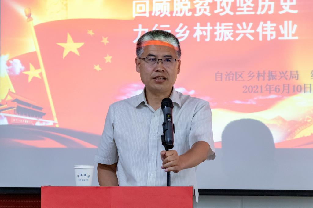 讲座伊始,杨国涛介绍了续建军并对他的到来表示热烈的欢迎。续建军,自治区乡村振兴局政策法规处处长,参加扶贫工作三十年,先后在原州区扶贫办、固原市扶贫办、自治区扶贫办、自治区乡村振兴局工作,主要从事全区扶贫工作政策研究,主持起草了自治区“十二五”以来系列重要政策规划,具有深厚的理论功底和丰富的实践经验。杨国涛向党员们介绍了在党的领导下中国人民脱贫攻坚的历史。脱贫攻坚这场历时八年的艰苦战役,堪称载入人类史册的中国奇迹。占世界五分之一人口的中国,以全面小康路上一个不能少的强硬决心,圆满完成了对人民的许诺。