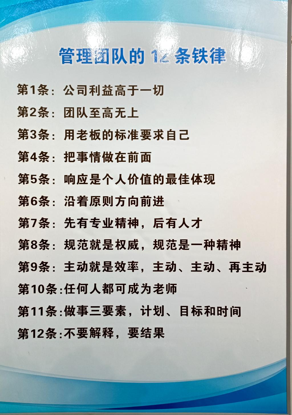 江苏润模管理团队的12条铁律:公司利益高于一切,团队至高无上,用老板的标准要求自己,把事情做到前面,响应是个人价值的最佳体现,沿着原则方向前进,现有专业精神、后有人才,规范就是权威、规范是一种精神,主动就是效率、主动、主动、再主动,任何人都可成为老师,做事三要素计划、目标和时间,不要解释、要结果。